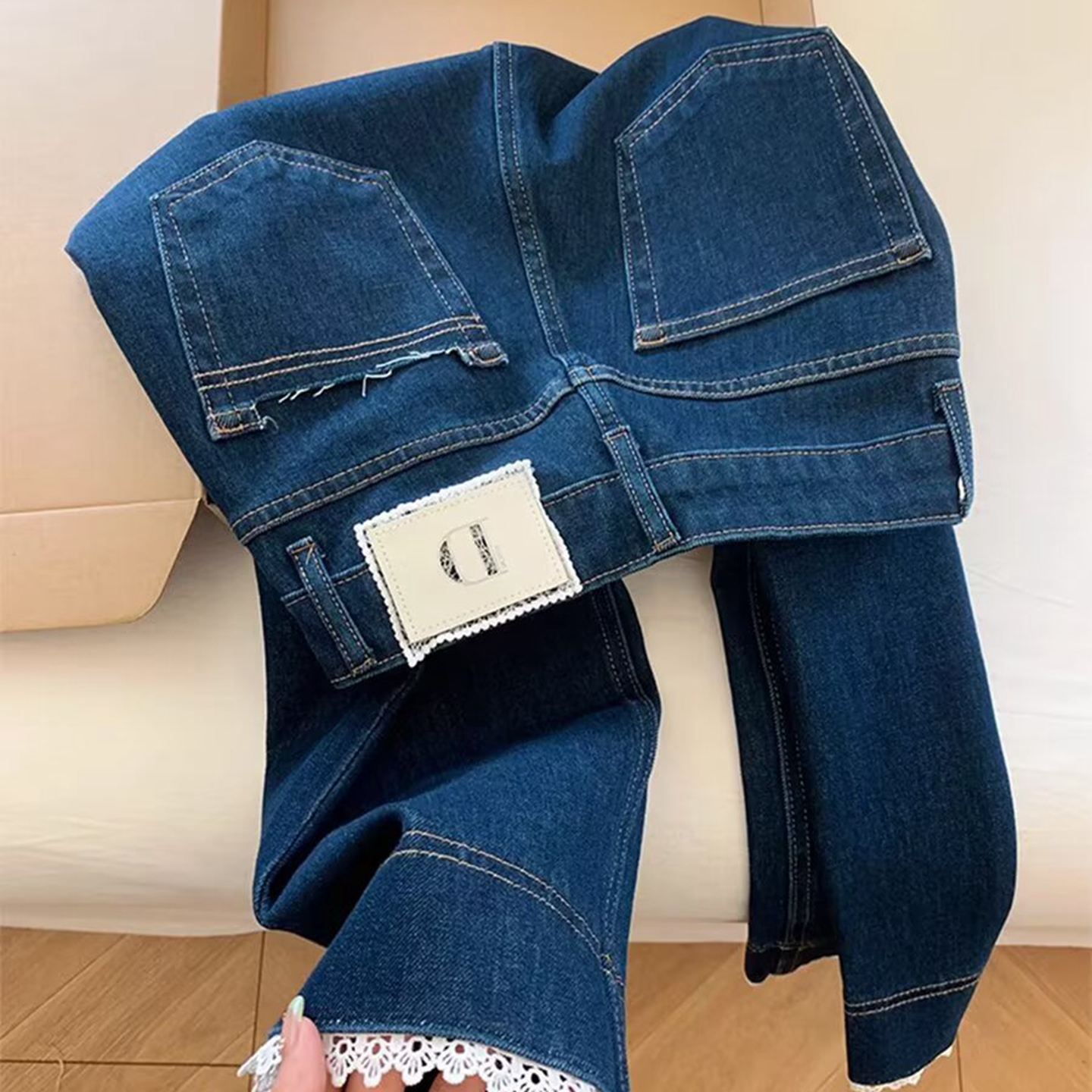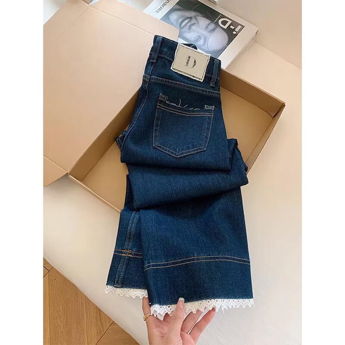 商品名称:洛兰沙家居馆【只代发】【只代发】 2025新款蕾丝花边直筒牛仔裤女夏薄款小个子九分裤大码胖mm显瘦浅色阔腿牛仔裤5 浅蓝