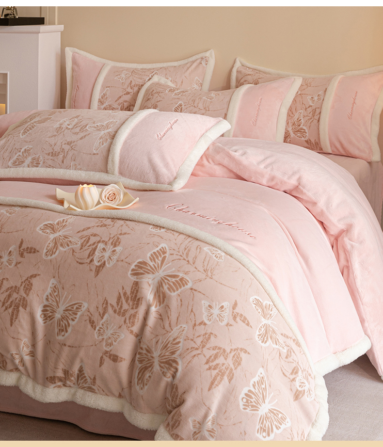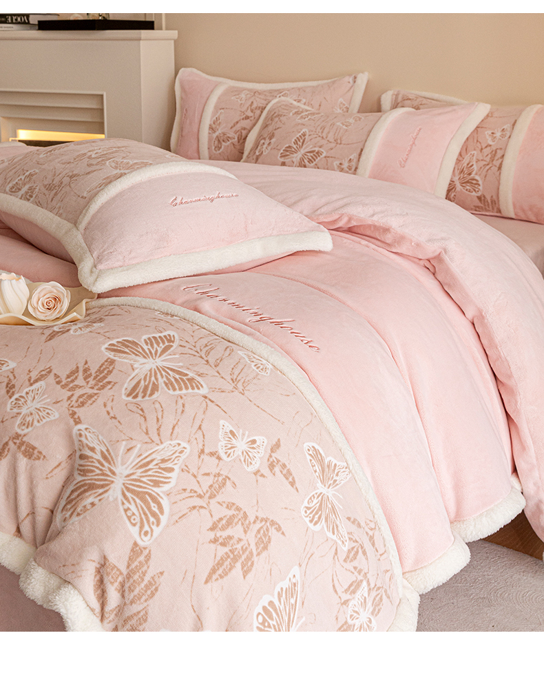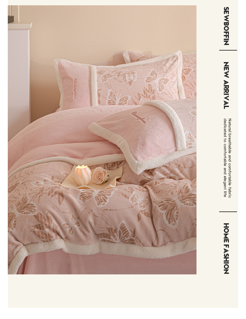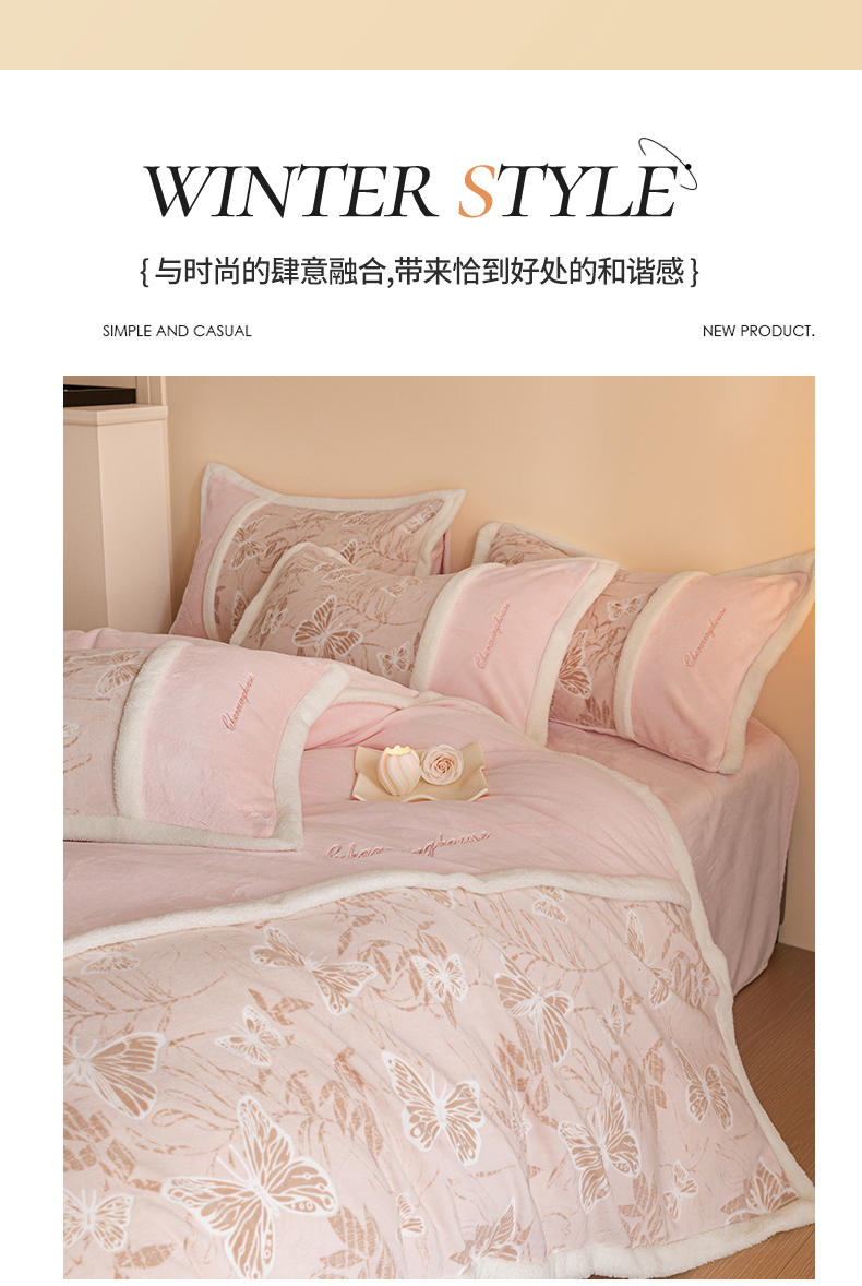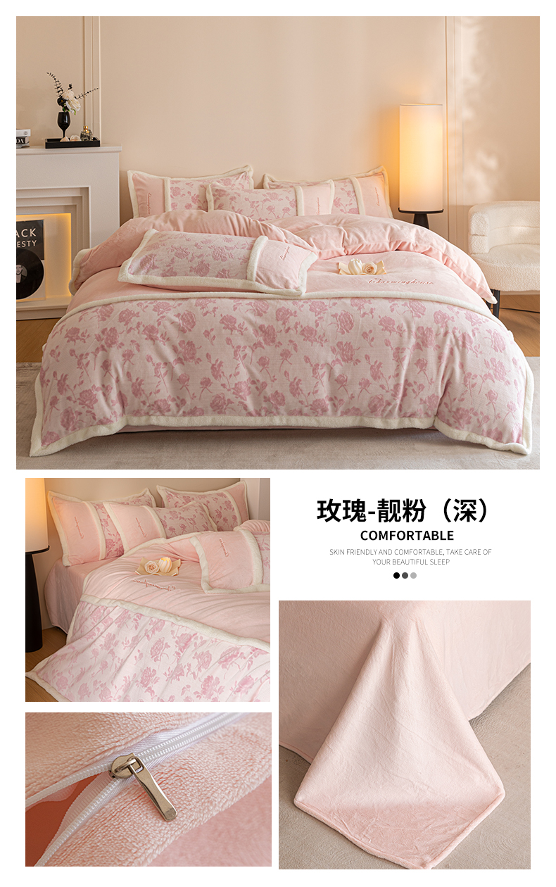 (总)遇见家居生活馆 2025新款A类牛奶绒雕花四件套-羽飞舞,卡诺粉+香槟,奶芋色+经典灰,奶芋色+杏仁,香草灰+经典灰,婴儿蓝+星辰灰