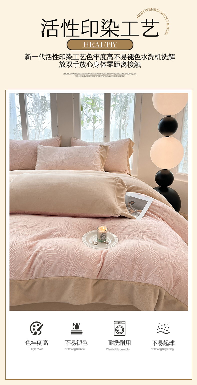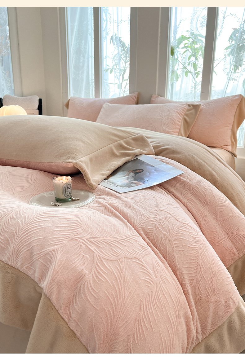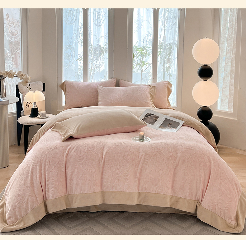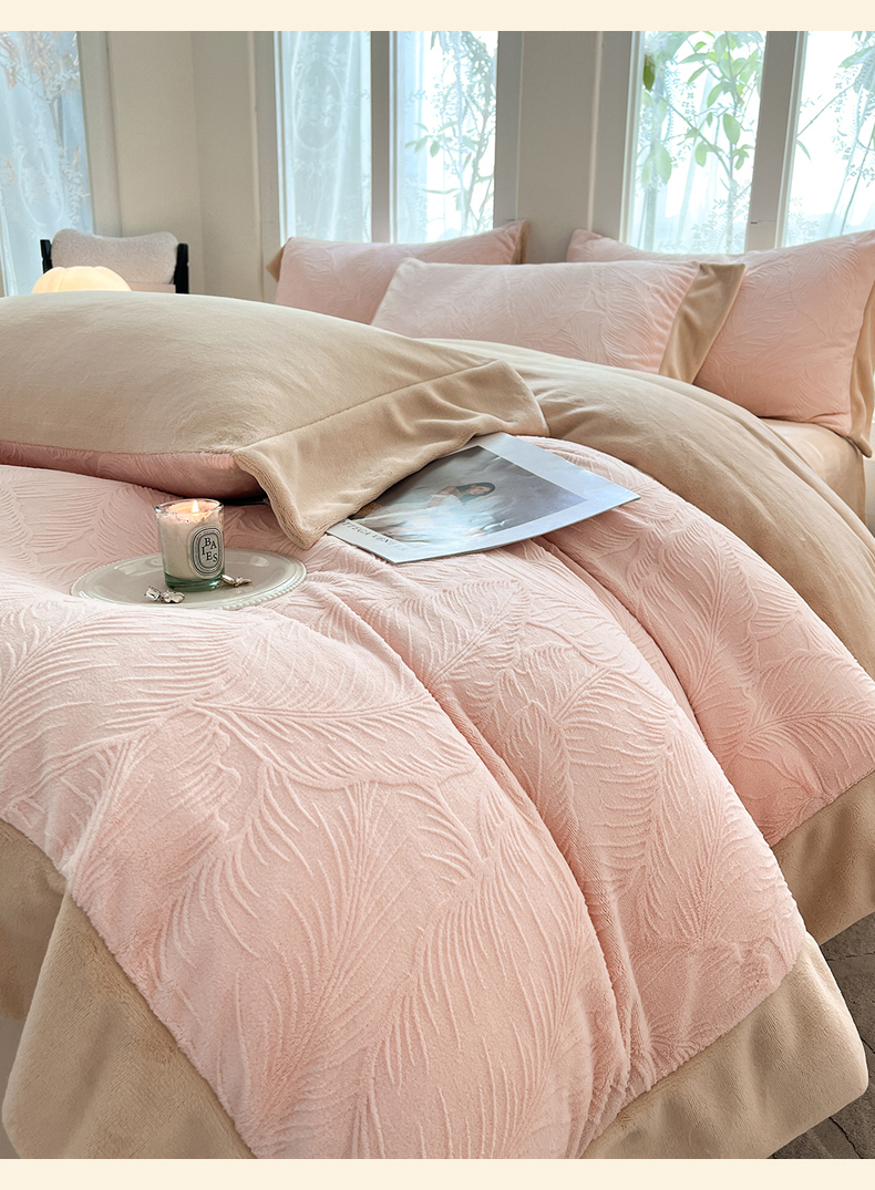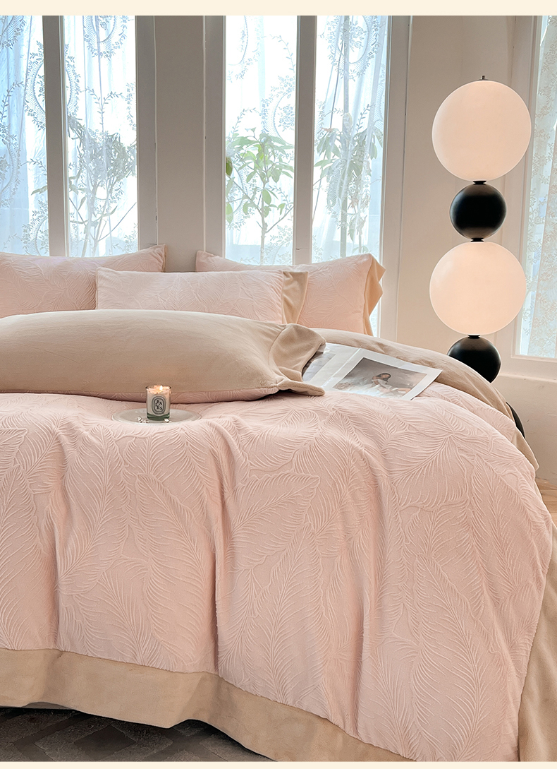 (总)遇见家居生活馆 2025新款A类牛奶绒雕花四件套-羽飞舞,卡诺粉+香槟,奶芋色+经典灰,奶芋色+杏仁,香草灰+经典灰,婴儿蓝+星辰灰