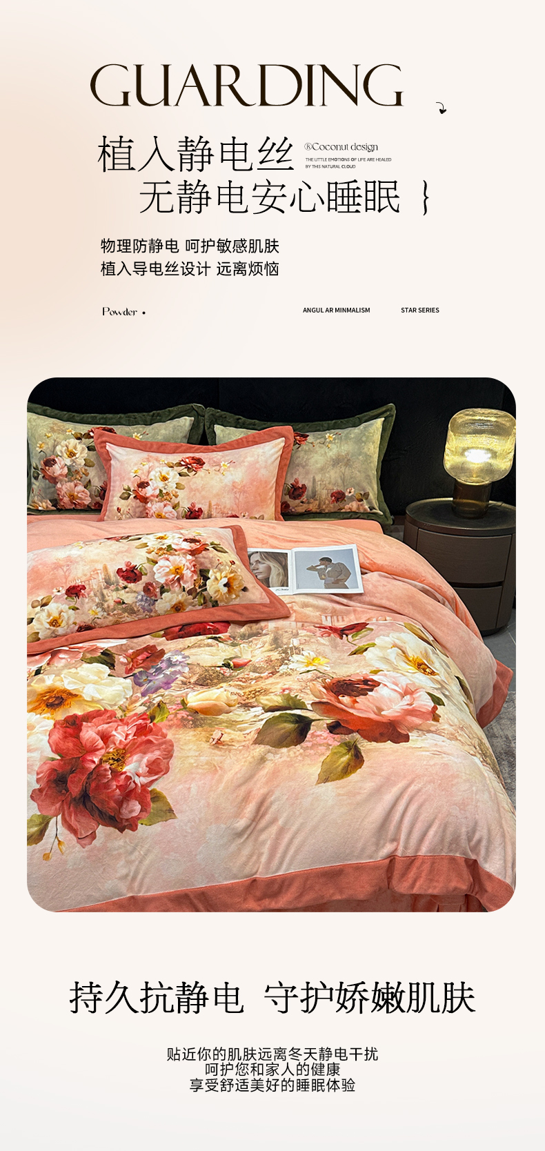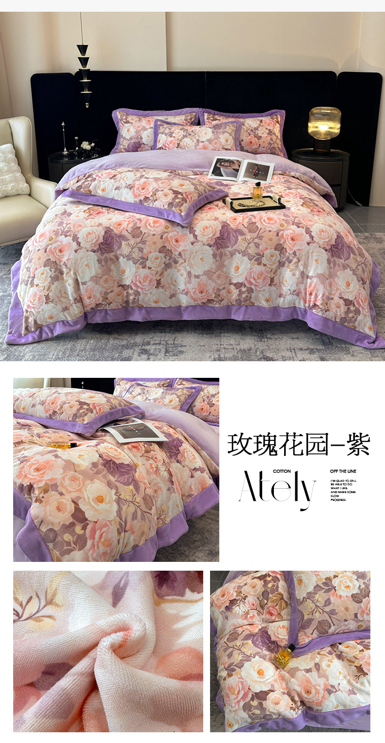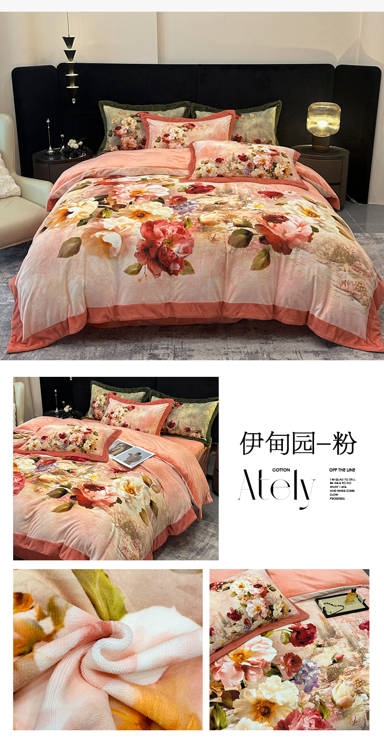诺梵家纺 2025新款数码印花牛奶绒四件套(控价:159) 玫瑰花园-粉