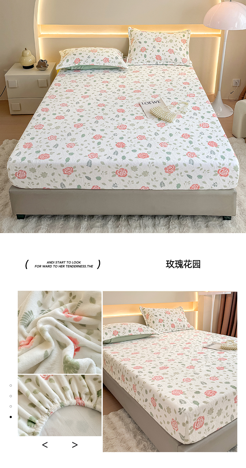 商品名称:金盛纺 2025新款高克重牛奶绒印花系列单床笠(可定制) 玫瑰花园