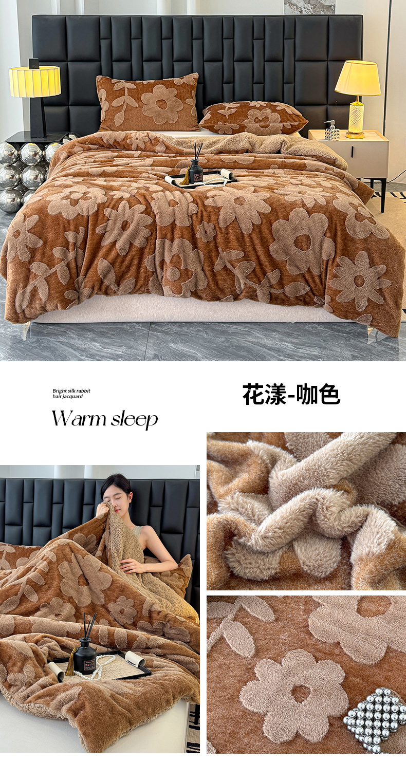 商品名称:枋梢家纺 2025新款亮丝兔毛绒兔毛提花暖居花漾羊羔绒 双层加厚保暖盖毯 居家午睡保暖毯 花漾-咖色