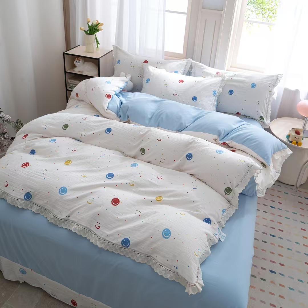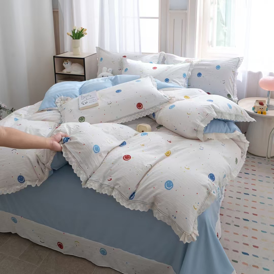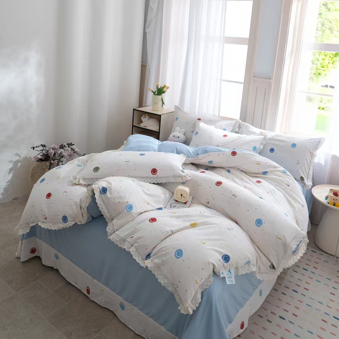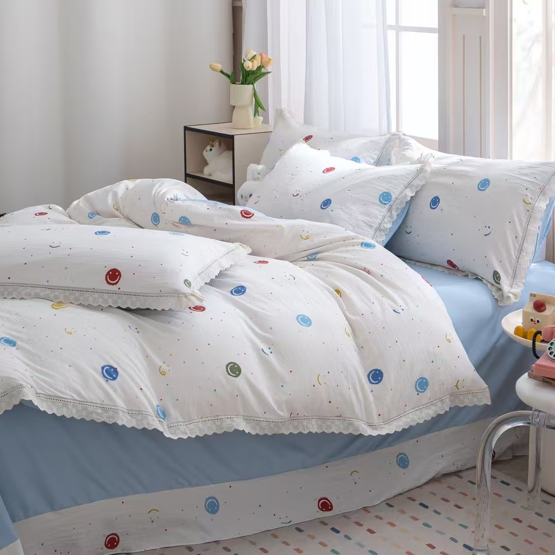 玖琳家纺 2025新款云朵水洗棉皱皱纱精致花边款四件套 笑脸