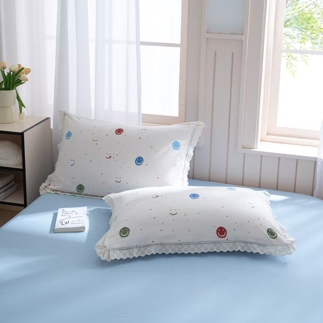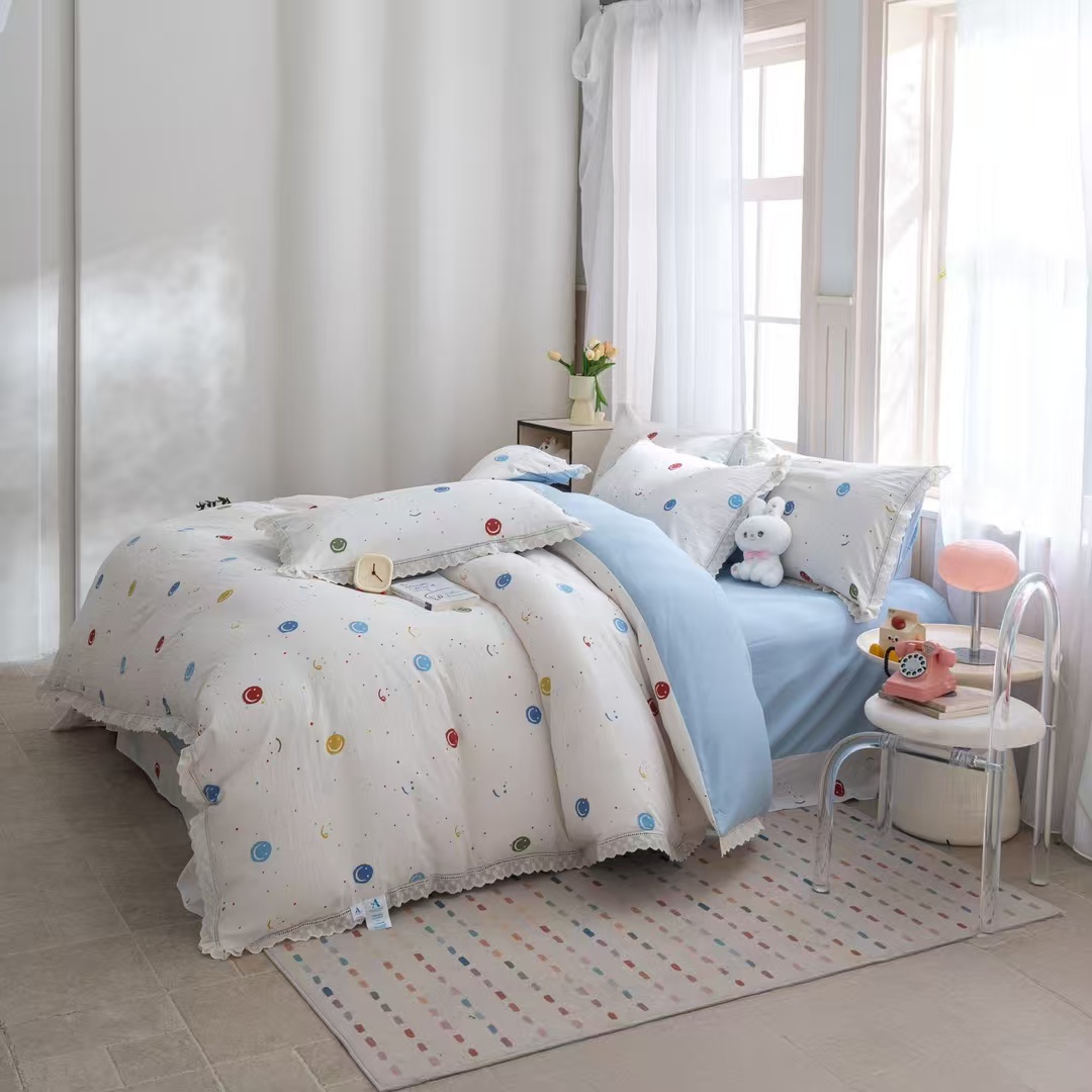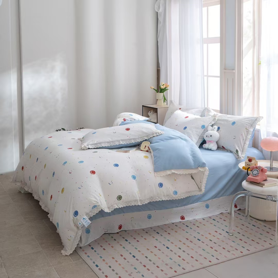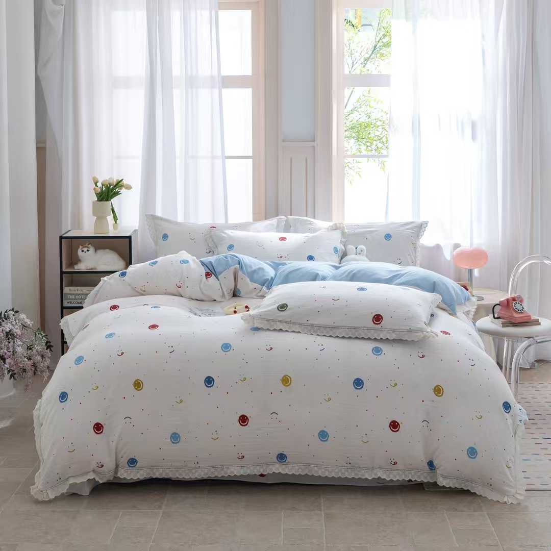 玖琳家纺 2025新款云朵水洗棉皱皱纱精致花边款四件套 笑脸