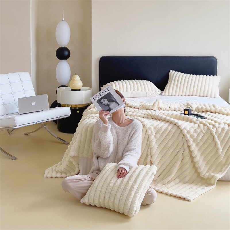玖琳家纺 2025新款多功能抽条兔兔毛绒毯 米白