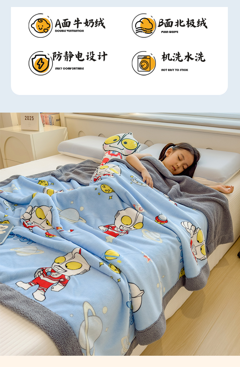 云恋家纺 2025新款儿童卡通加厚牛奶绒北极绒双层绒毛毯 超人奥特曼