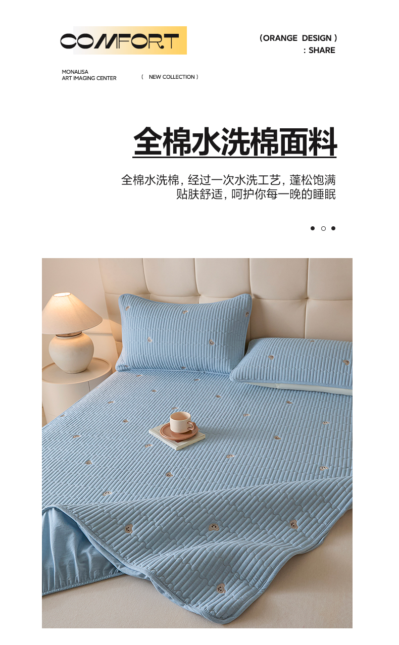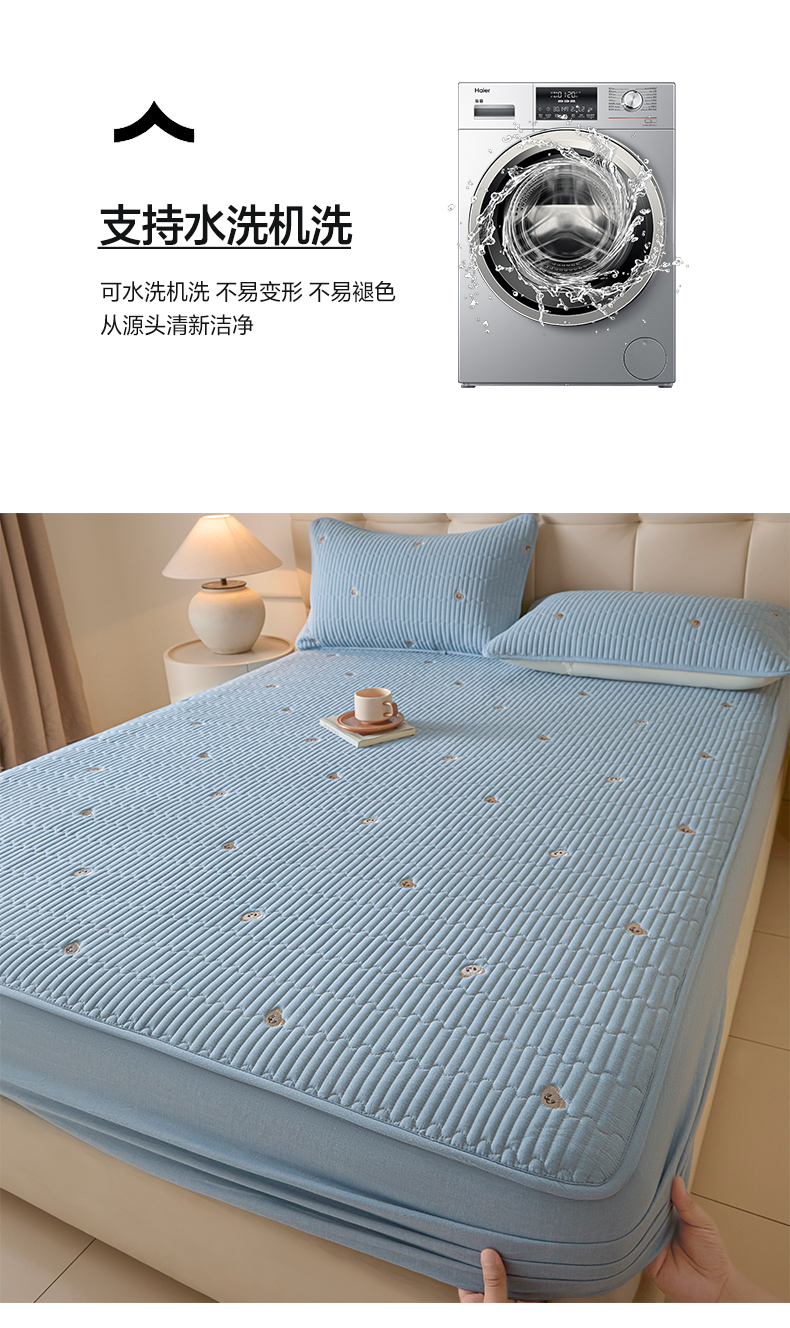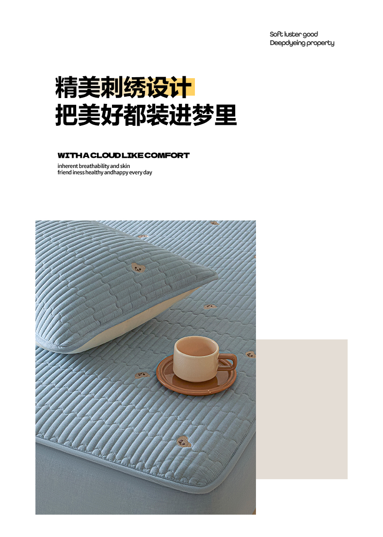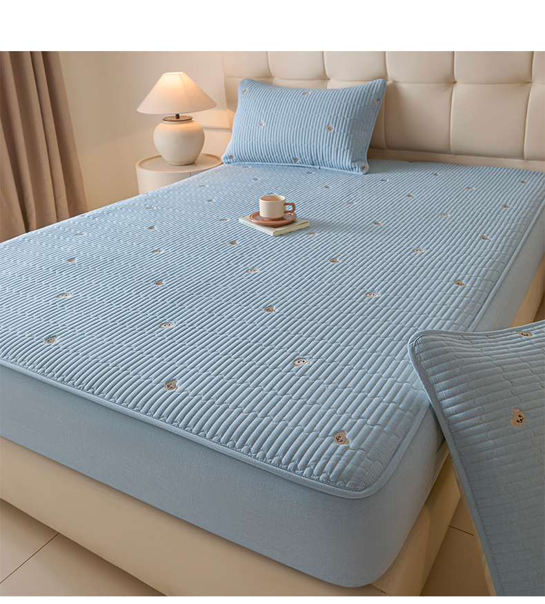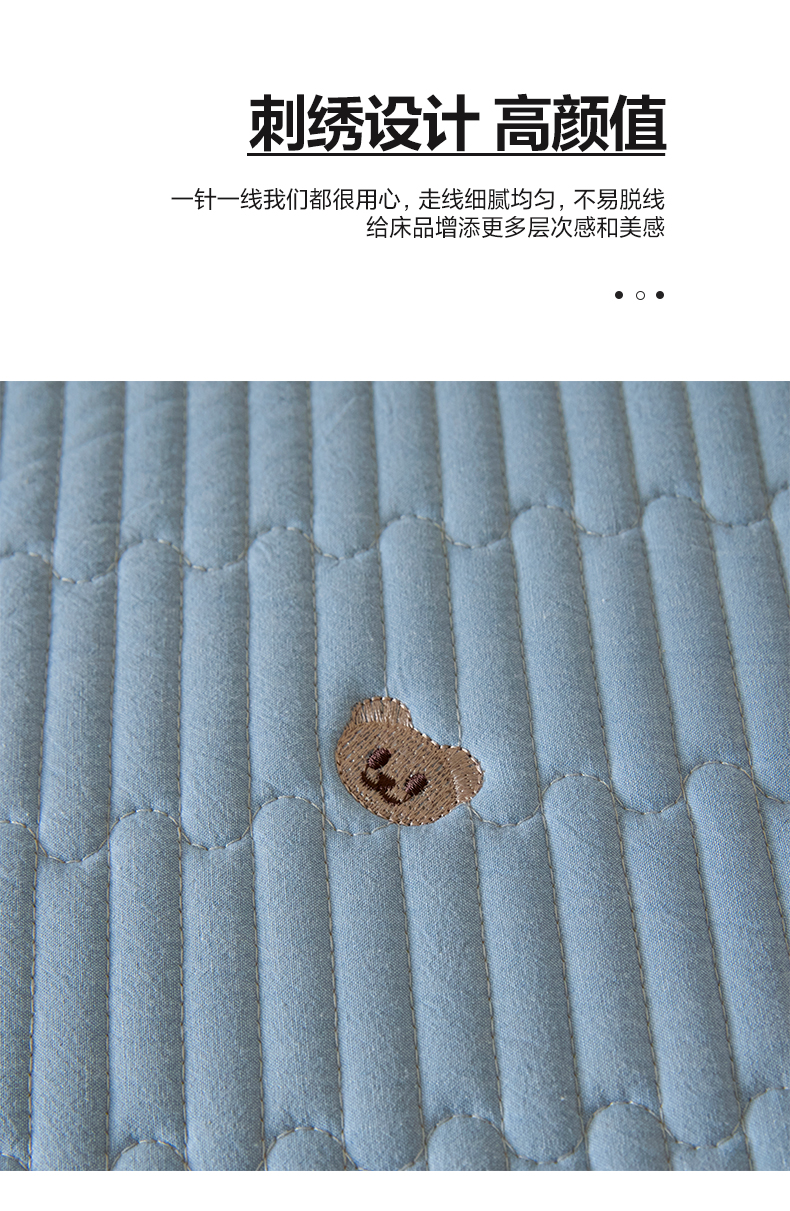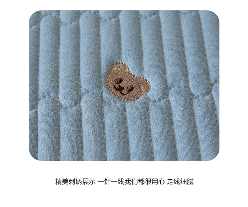 当前位置: 91家纺网 > 商品网购 > 床品套件 > 四件套 > 水洗棉四件套 > 卡伦家纺 2025新品全棉色织水洗棉刺绣夹棉床笠席梦思保护套小熊系列 雾蓝熊