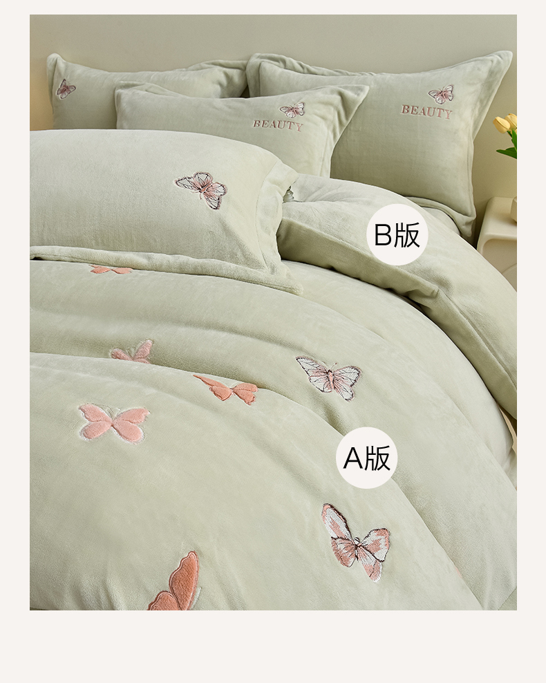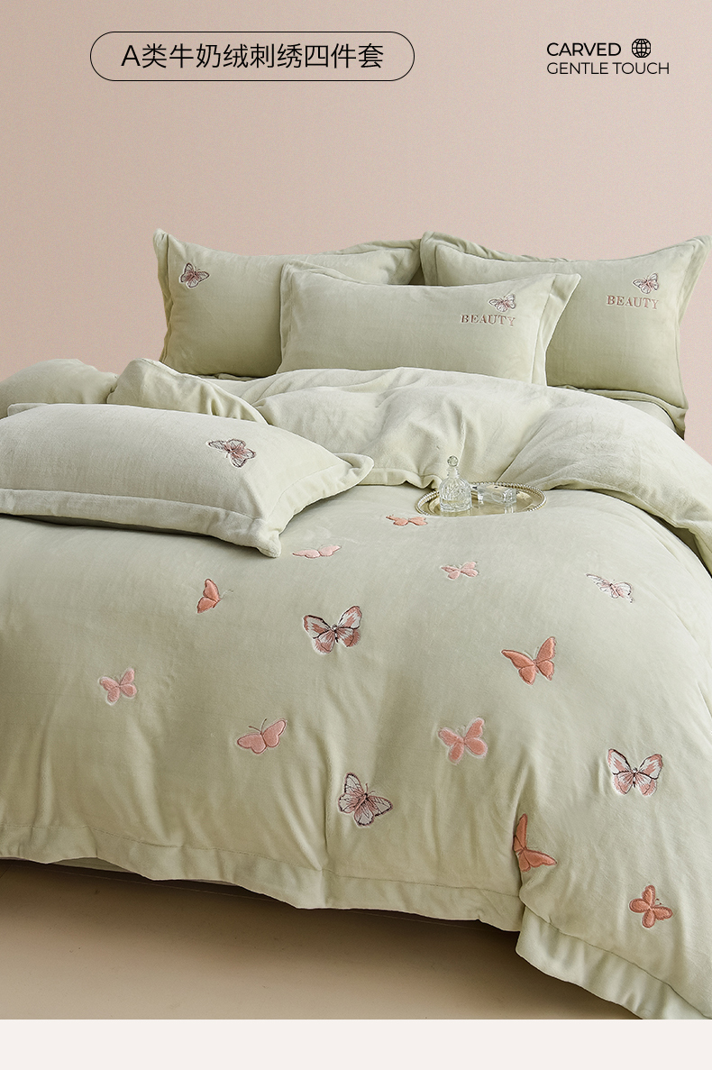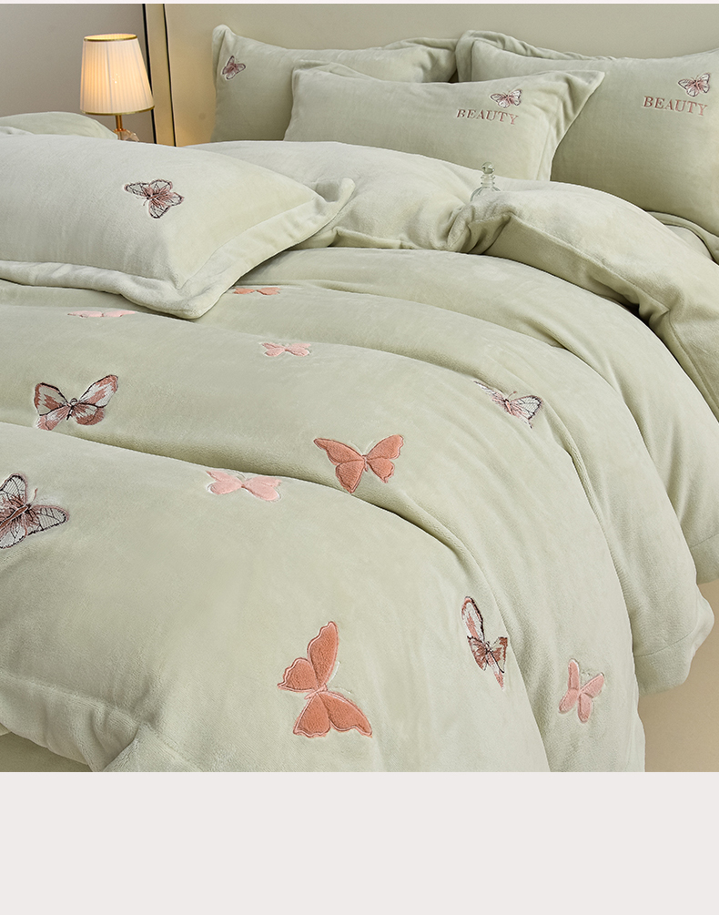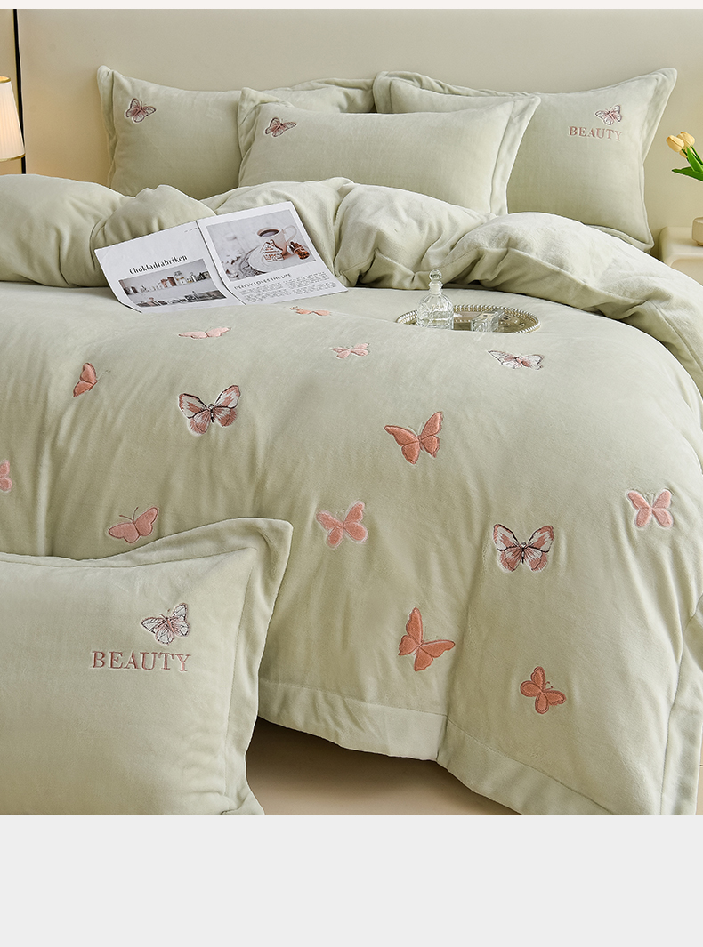 鼎飞家纺 2025新款加厚牛奶绒蝴蝶绣花四件套-梦蝶 梦蝶-诺绿