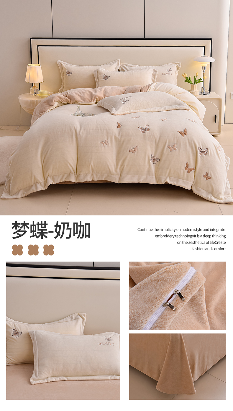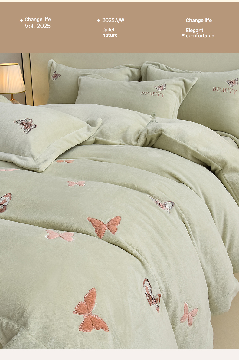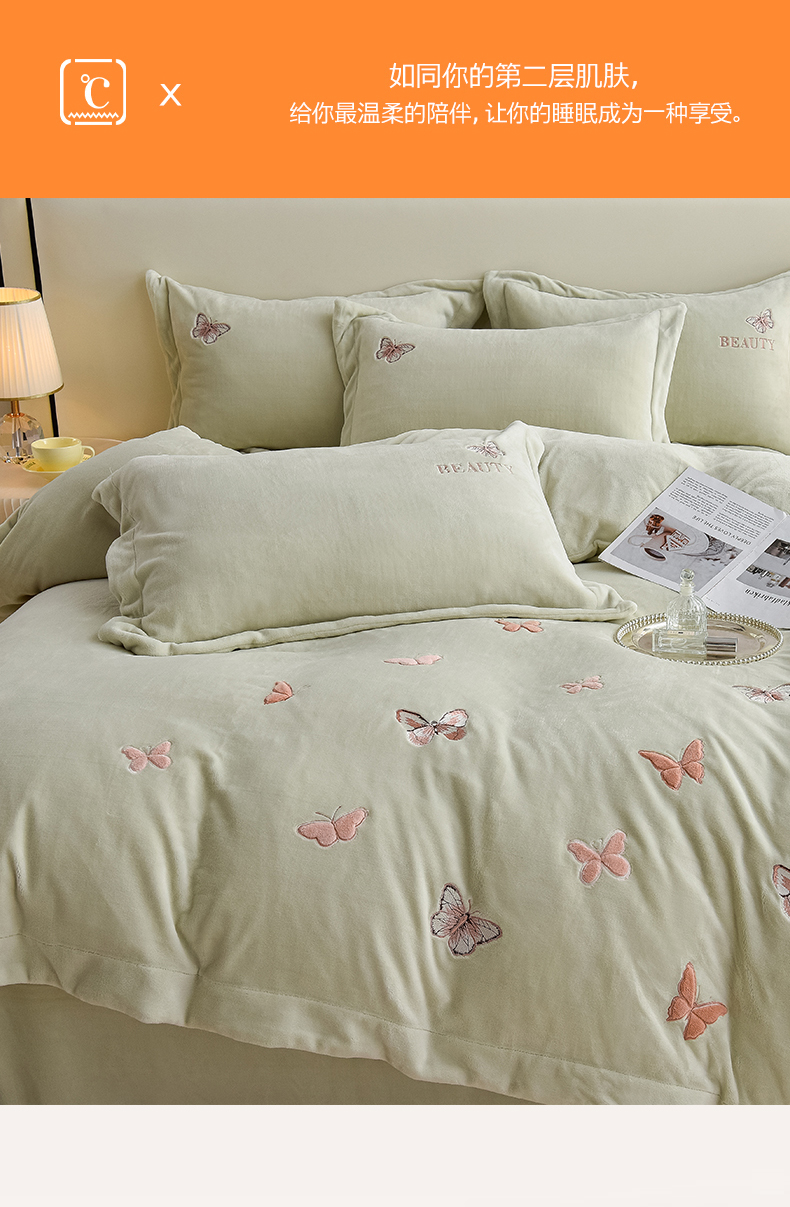 鼎飞家纺 2025新款加厚牛奶绒蝴蝶绣花四件套-梦蝶 梦蝶-诺绿
