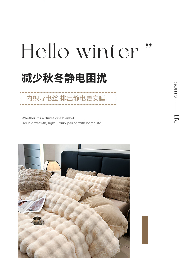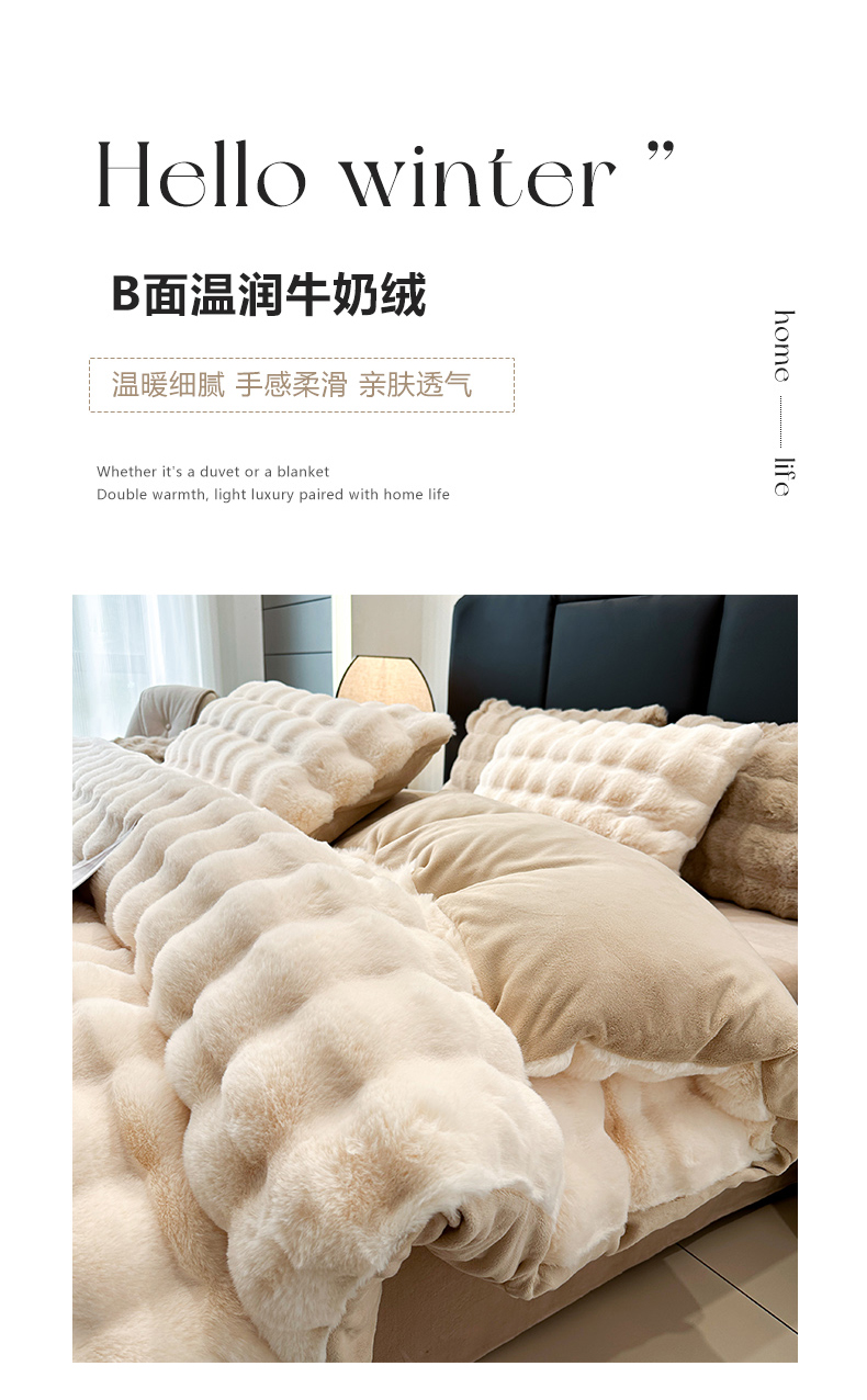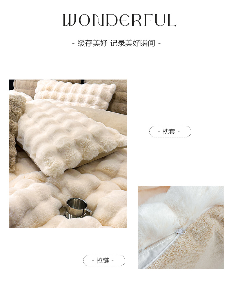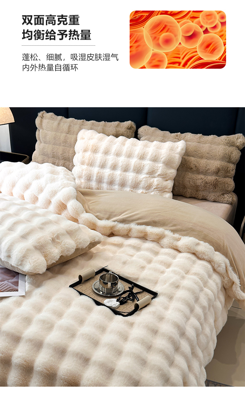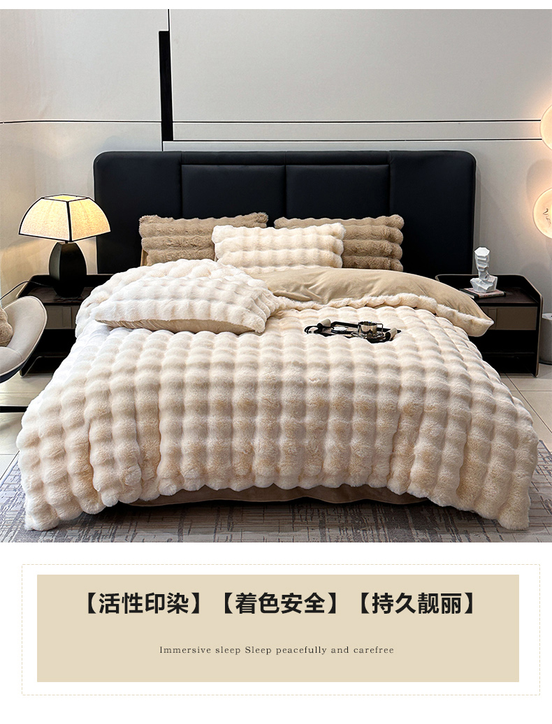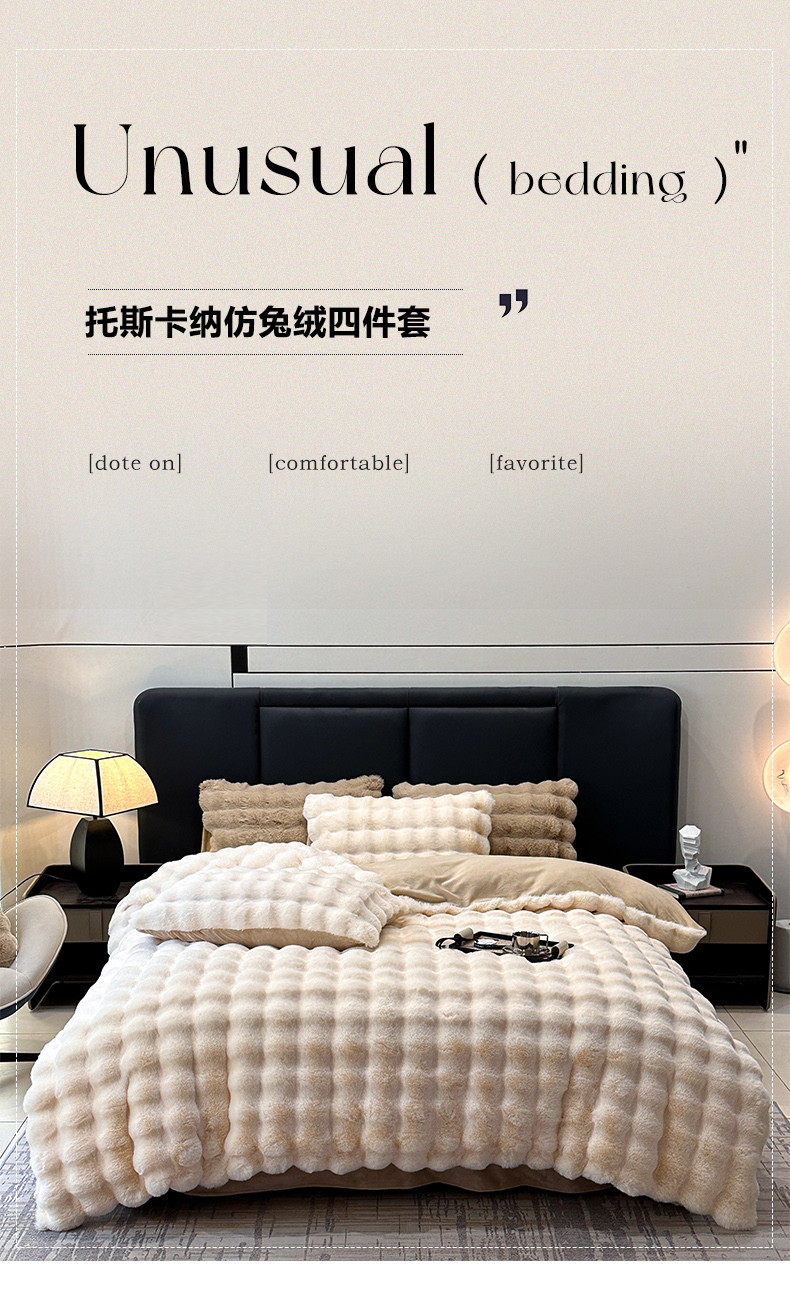 商品名称:宜代光年 2025新款托斯卡纳仿兔绒四件套-炫彩兔毛套件 托卡兔绒-白咖色