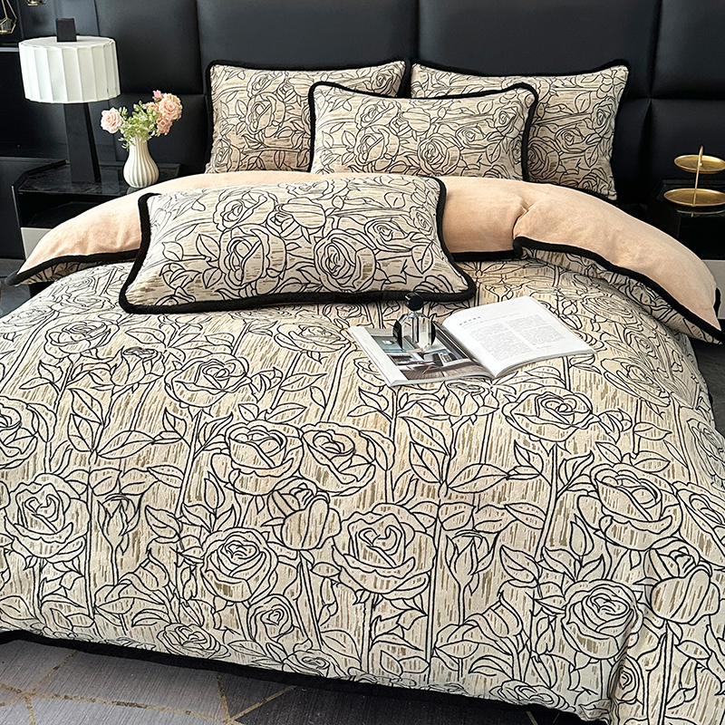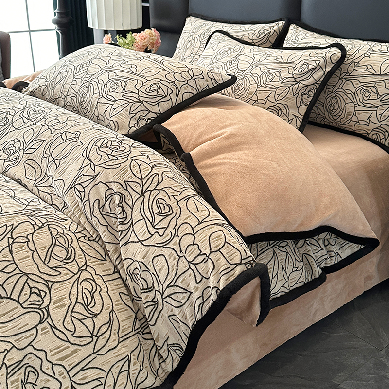 商品名称:柏薇 2025新款兔毛宽包边立体雕花牛奶绒四件套 山茶花