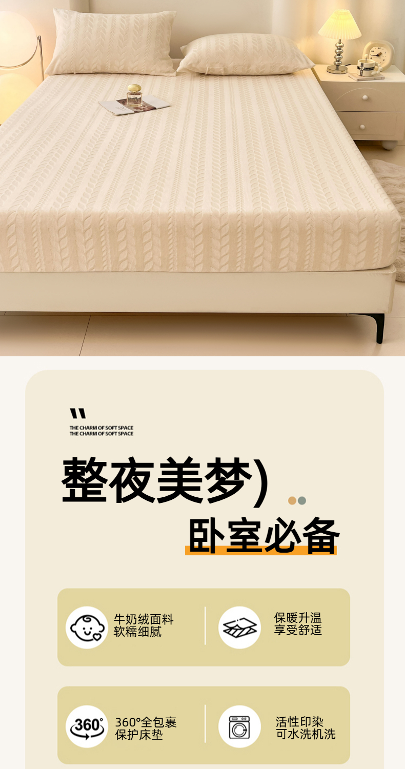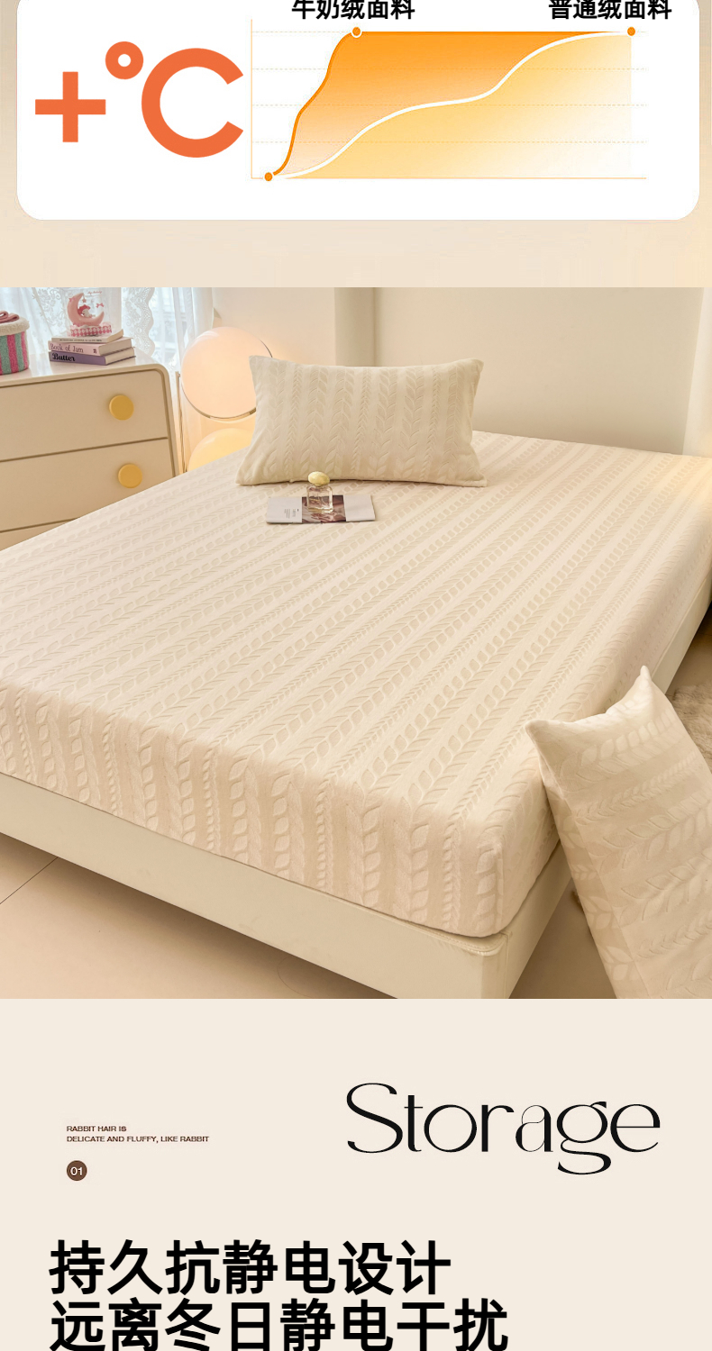 三盛源 2025新款高克重雕花牛奶绒床笠三件套加厚保暖床垫保护套 麦穗-奶油白