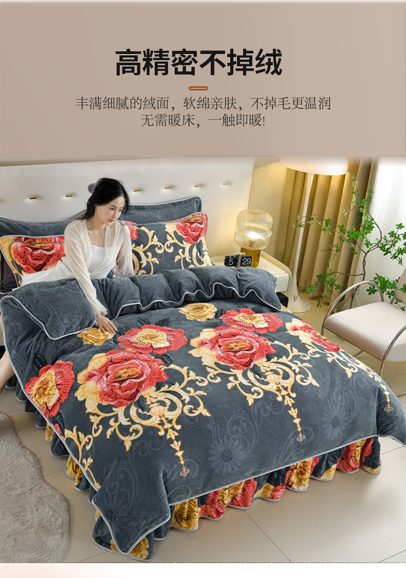 (总)雅芝蓝2024魔法绒雪花雕花水晶法莱绒四件套,绅士灰,豆沙粉,酒红,藕粉,藏青,绿果白,水绿,柠黄檬