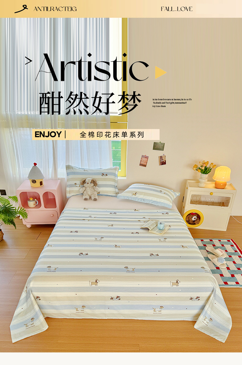 当前位置: 91家纺网 > 商品网购 > 床上用品 > 床单 > 尚帛 2026新款全棉品质喷气印花爆款四件套 多规格套件 单品系列-单床单 奔跑小狗