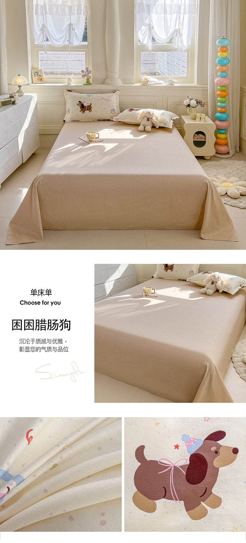 名优家纺 2026新款12868全棉小清新印花四件套单品系列-单床单 困困腊肠狗