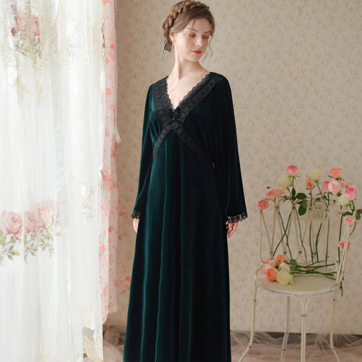 商品名称:洛兰沙家居馆 2026新款秋冬宽松复古宫廷绒款V领睡裙睡袍长袖长款公主保暖家居服绒睡衣 红色