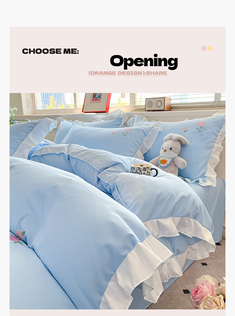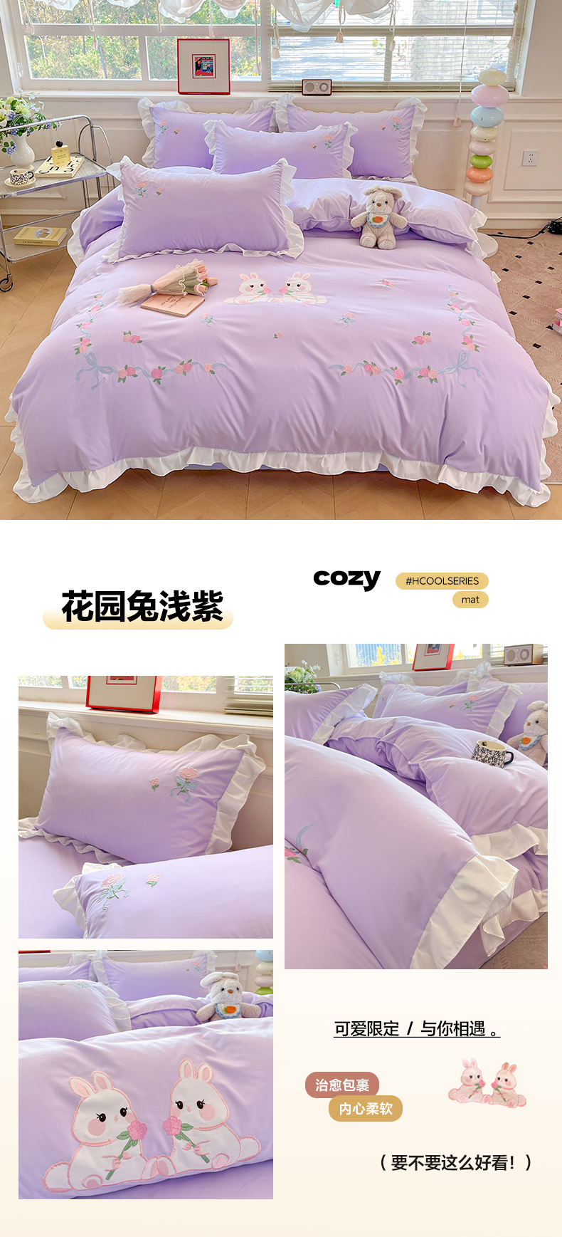 当前位置: 91家纺网 > 商品网购 > 床品套件 > 四件套 > 水洗棉四件套 > 雨菲家纺 2026新款水洗棉贴布绣公主风荷叶花边四件套-花园兔 花园兔浅紫