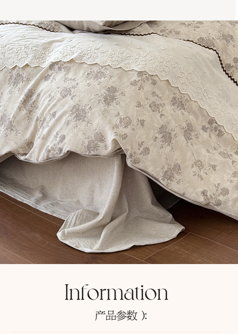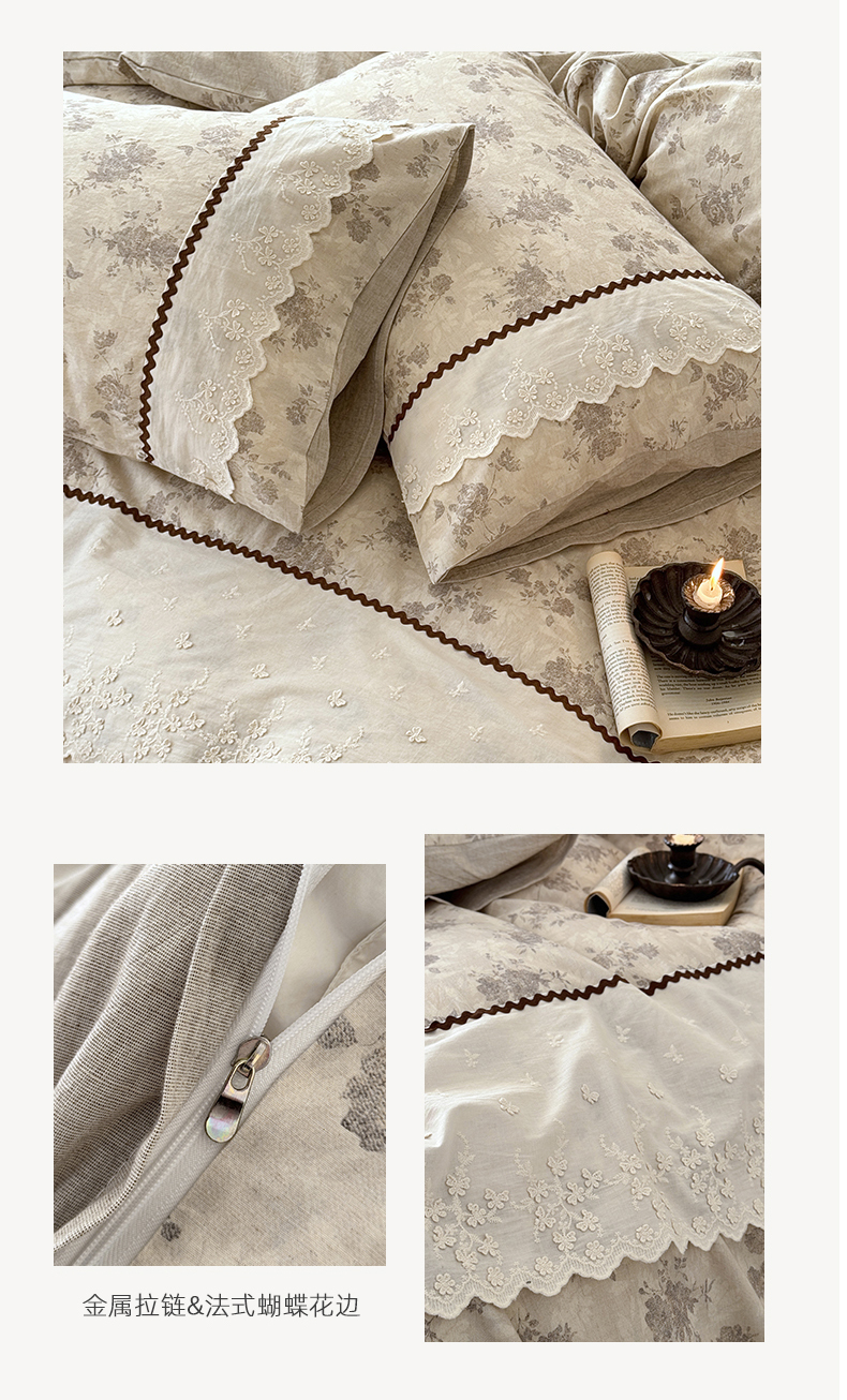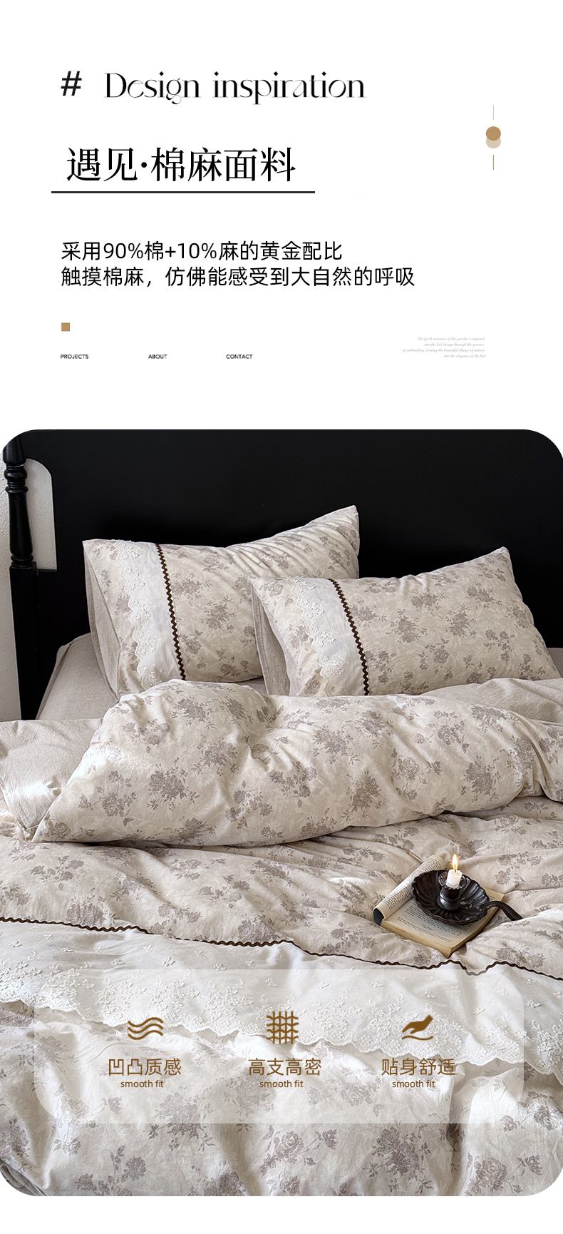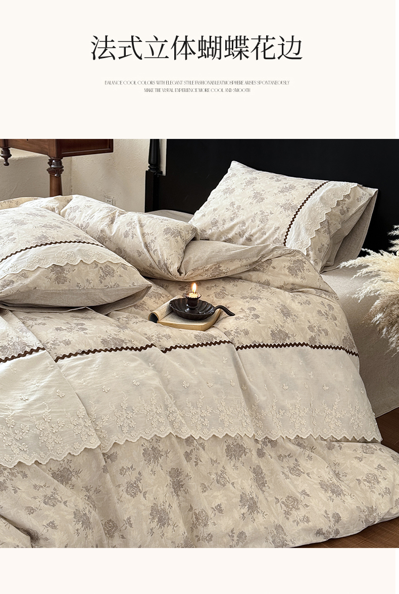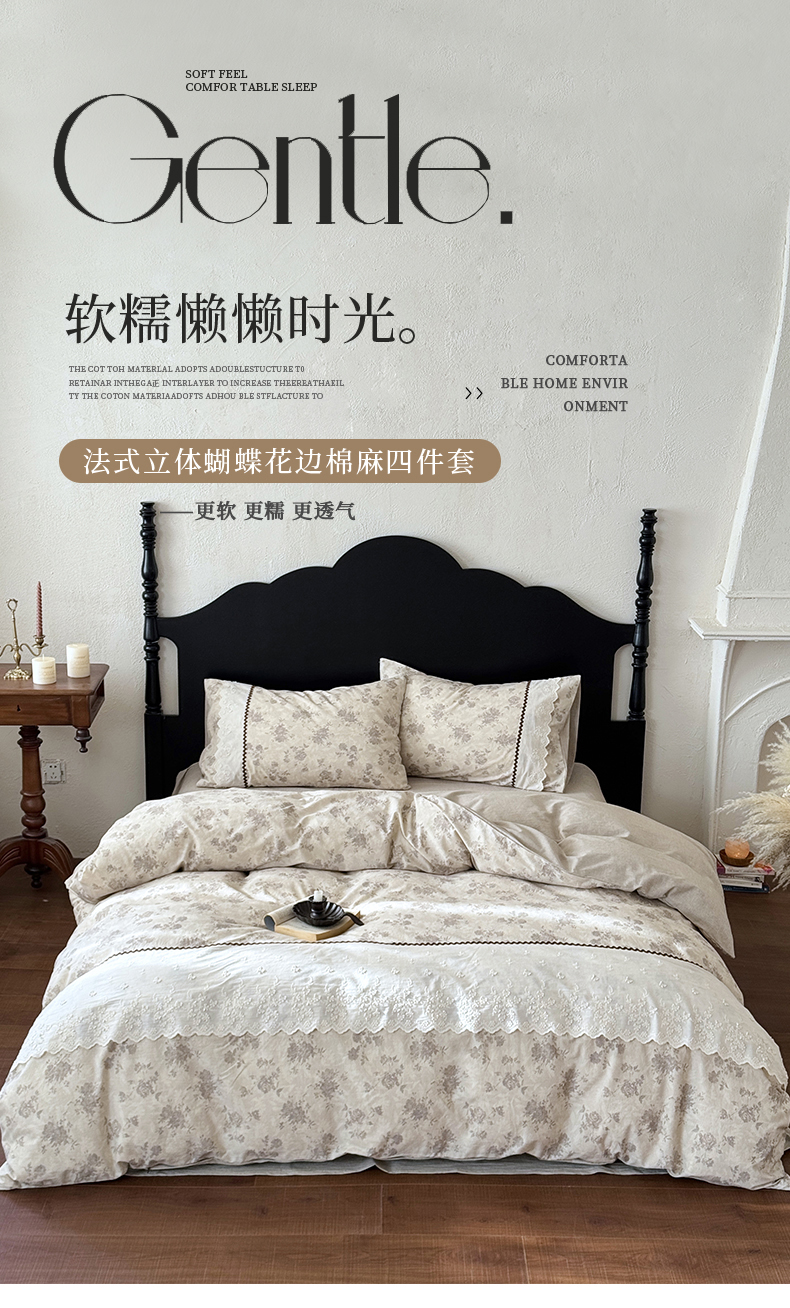 商品名称:淑女公社家纺 2026新款法式立体蝴蝶花边棉麻四件套 时雨 咖