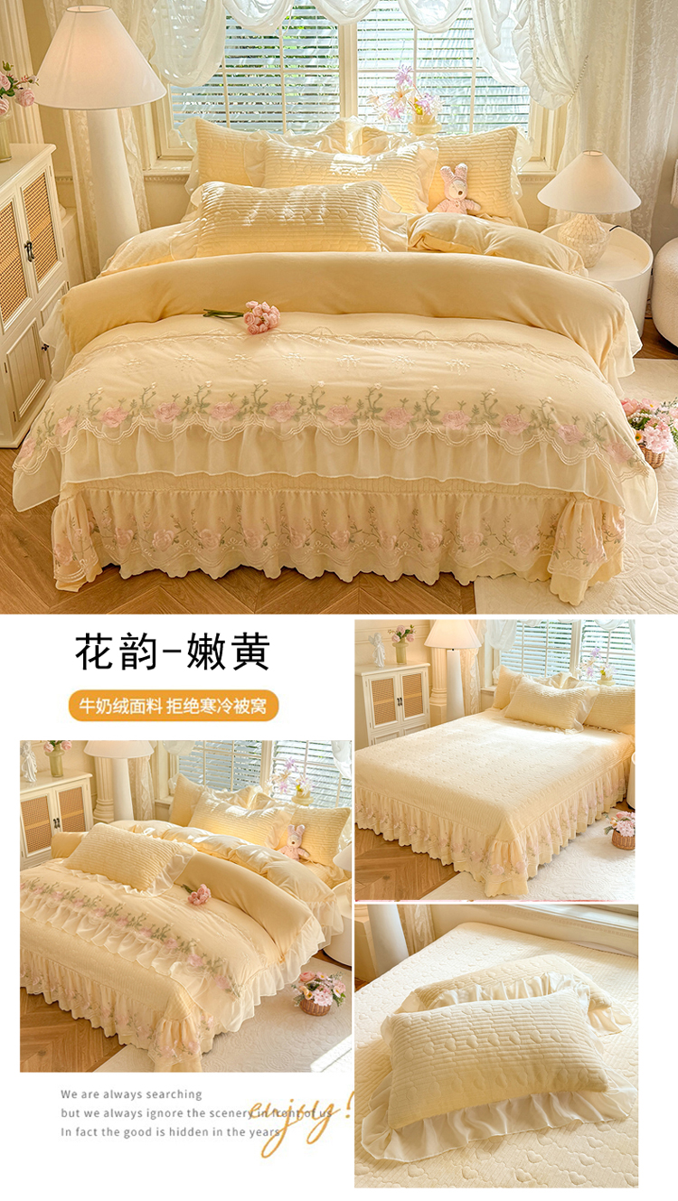 (总)漫布云 2026新款230g高克重韩版立体盘花牛奶蚕丝绒绣花四件套床裙款被套-洛丽塔系列,洛丽塔-嫩黄 ,洛丽塔-香芋紫,洛丽塔-珍珠粉, 洛丽塔-婴儿蓝