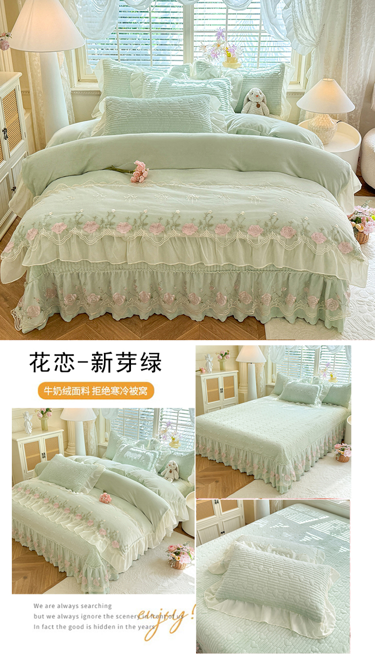 漫布云2026秋冬新款11斤230g全消光牛奶绒夹棉床盖款四件套纯色蕾丝花边刺绣床裙款床盖,蝶恋花-梦幻紫, 蝶恋花-嫩黄, 蝶恋花-新芽绿 ,蝶恋花-婴儿蓝 ,蝶恋花-樱花粉