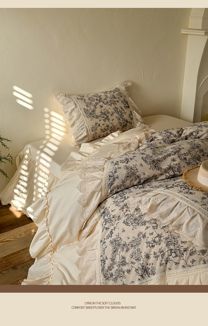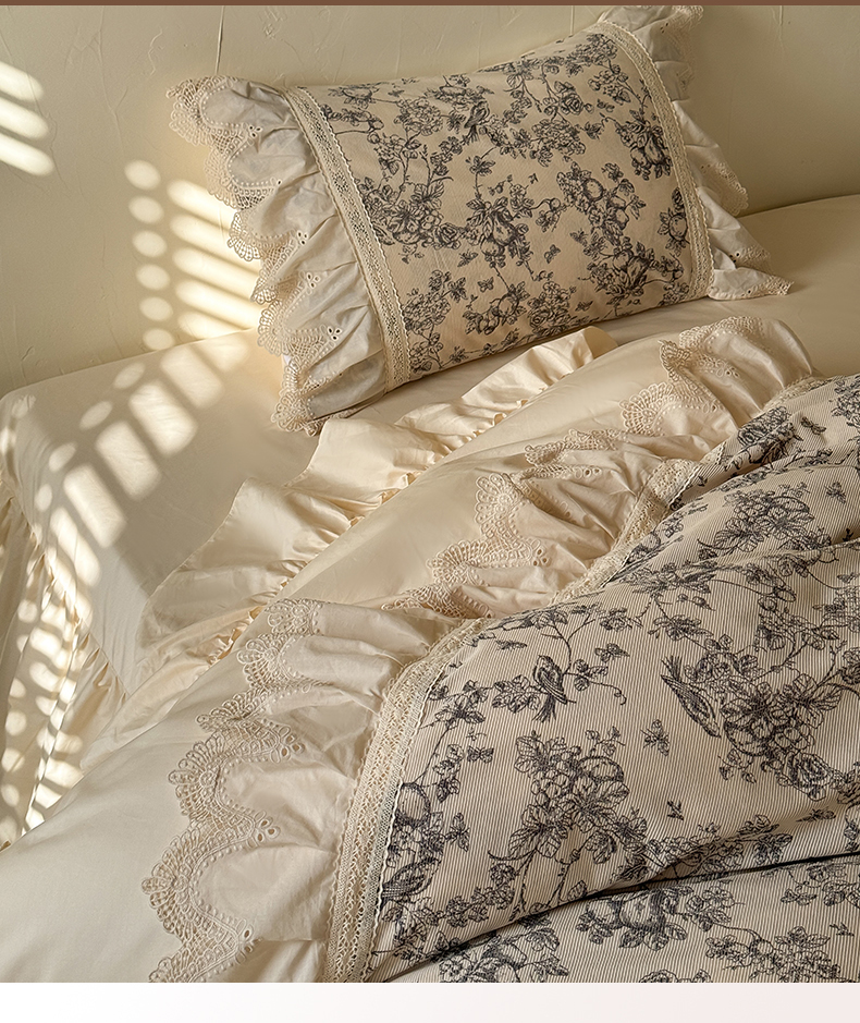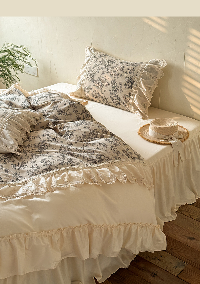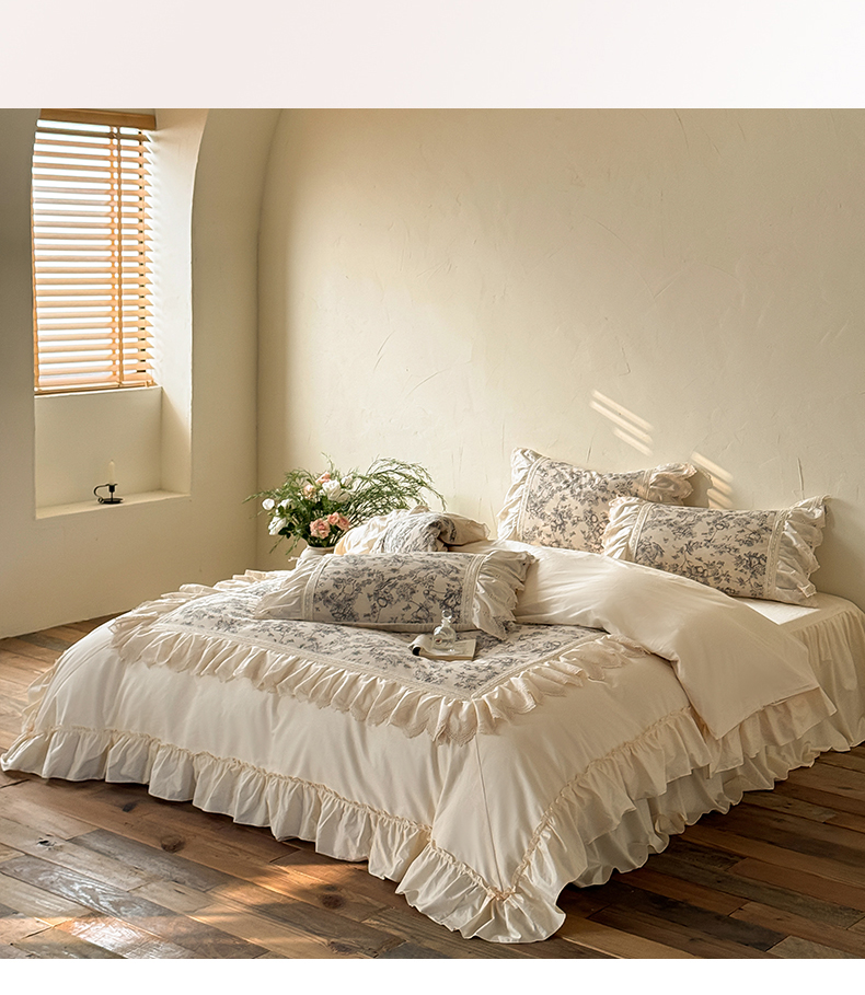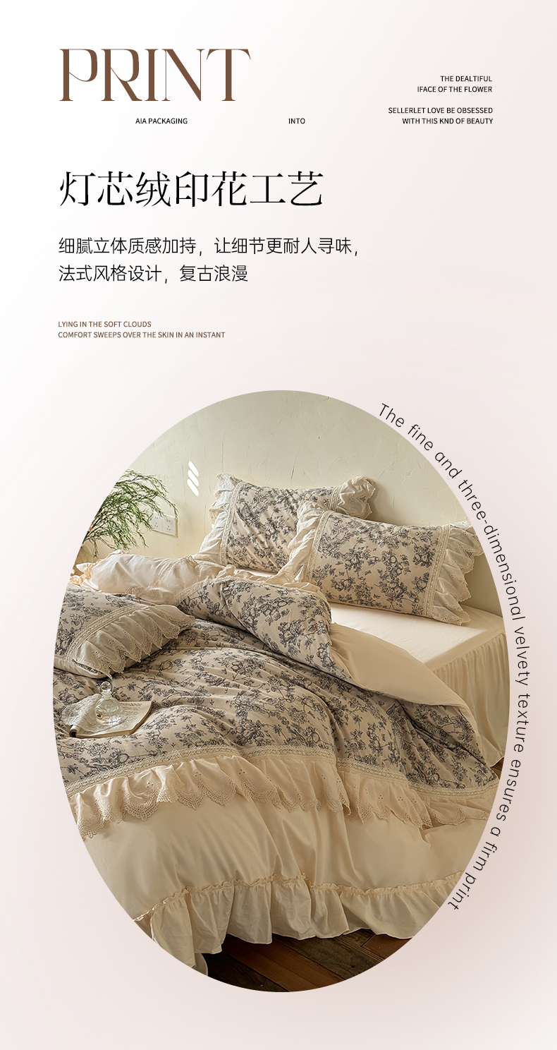 惯盈家纺 2026新款法式复古灯芯绒印花全棉花边床裙款全棉四件套-素写(含买家秀) 素写-奶芙