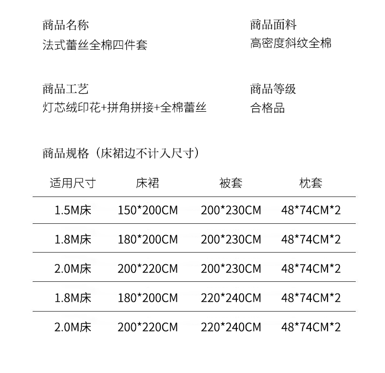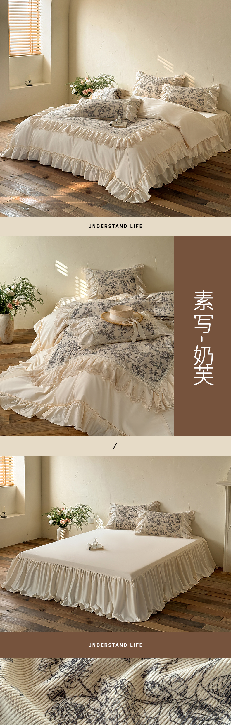 商品名称:惯盈家纺 2026新款法式复古灯芯绒印花全棉花边床裙款全棉四件套-素写(含买家秀) 素写-奶芙