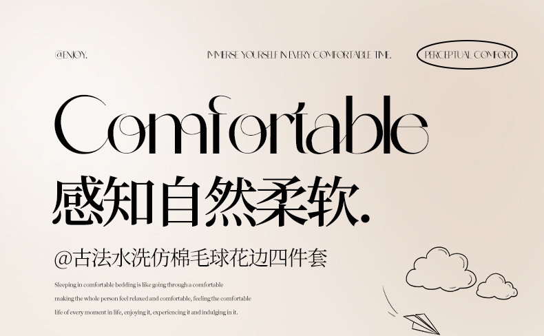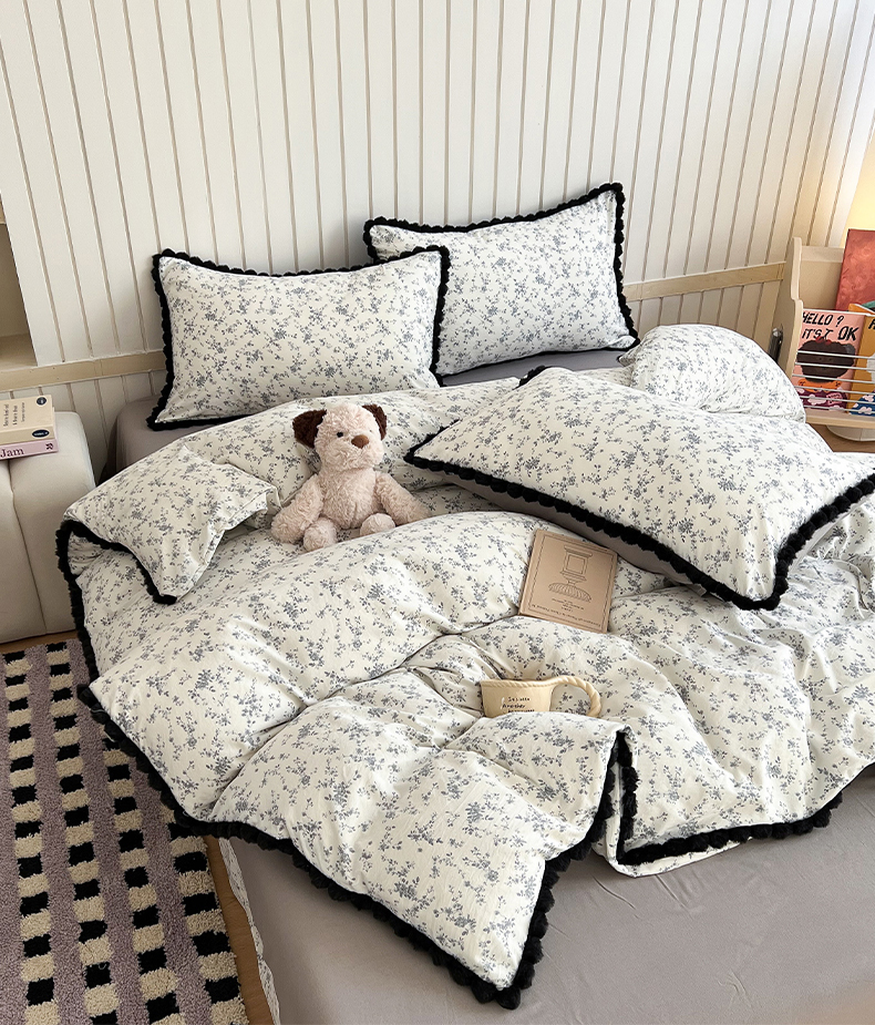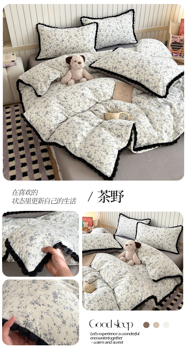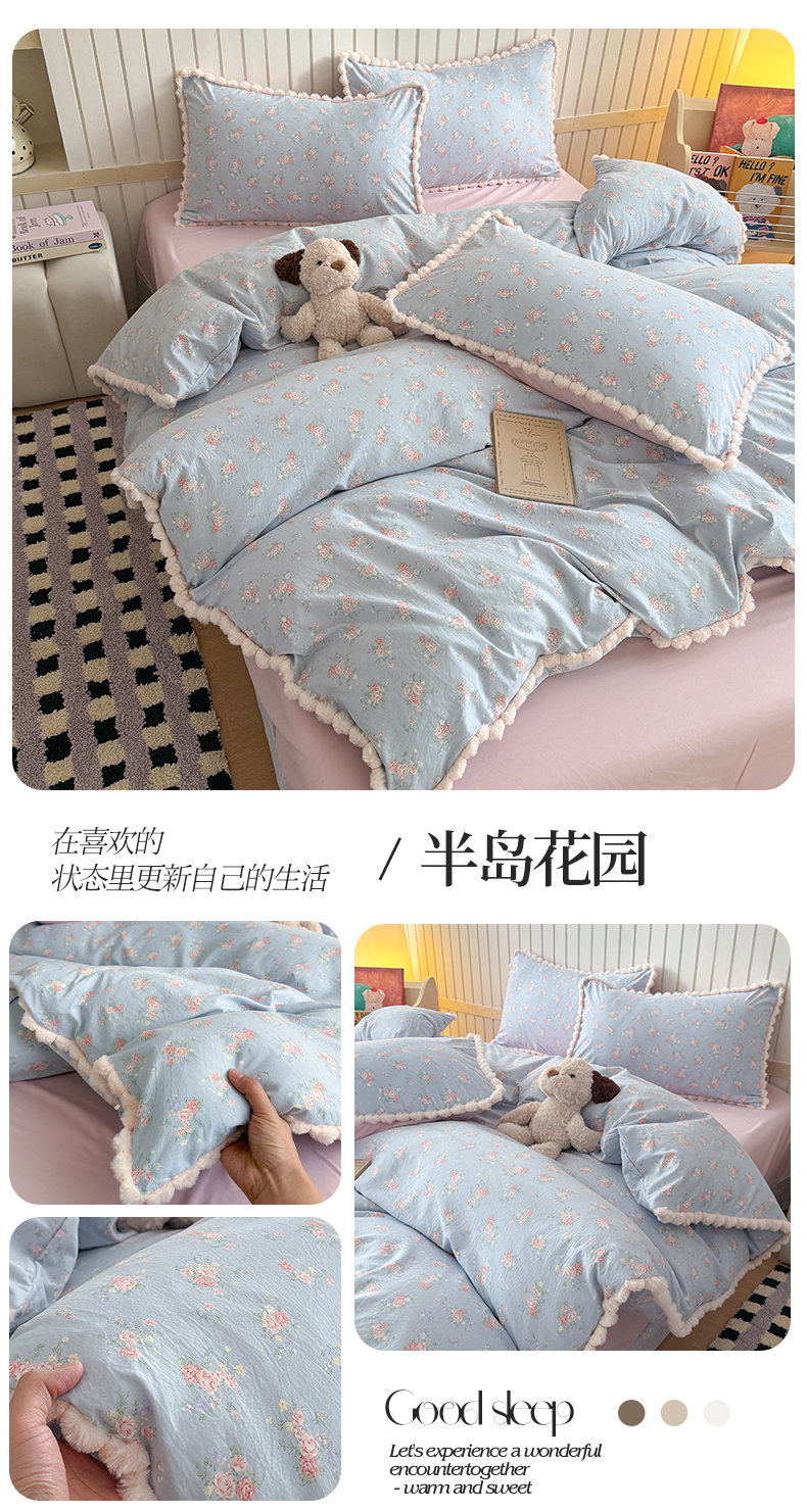 吾欢心 2026春夏新款古法水洗仿棉毛球花边款四件套 萌星人