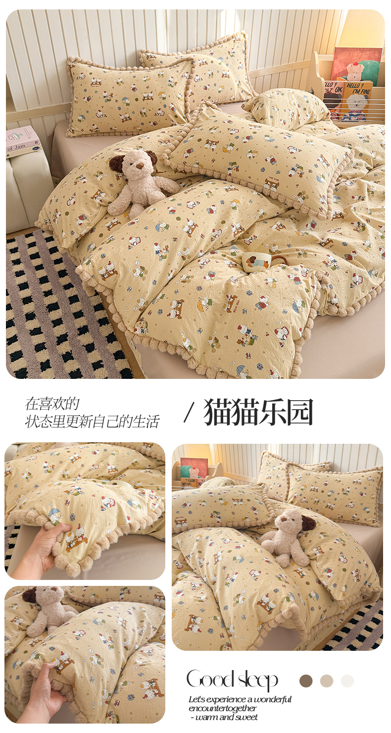 (总)吾欢心 2026春夏新款古法水洗仿棉毛球花边款四件套,半岛花园,茶野,椿屿,丛林小兔,粉豹纹,花颜悦色,咖豹纹,猫猫乐园,萌星人,甜心宝贝,小橘子,幸运小猫
