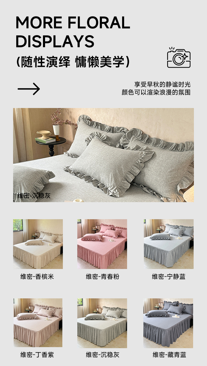 (总)忘忧草 2026新款纯色色织芙蓉棉床裙四件套-维密系列,维密-香槟米,维密-薄荷绿,维密-藏青蓝,维密-沉稳灰,维密-丁香紫,维密-宁静蓝,维密-青春粉