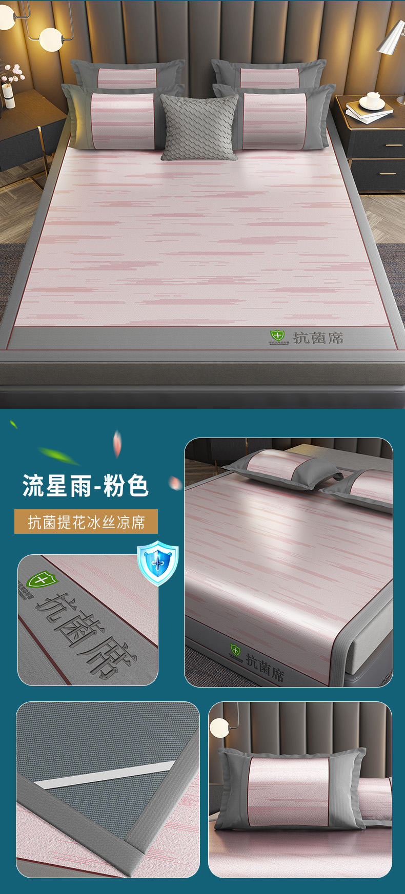 (总)2023新款超精密冰丝席-小斜纹系列-床笠款藤席凉席竹席,粉色,蓝色,绿色,银灰