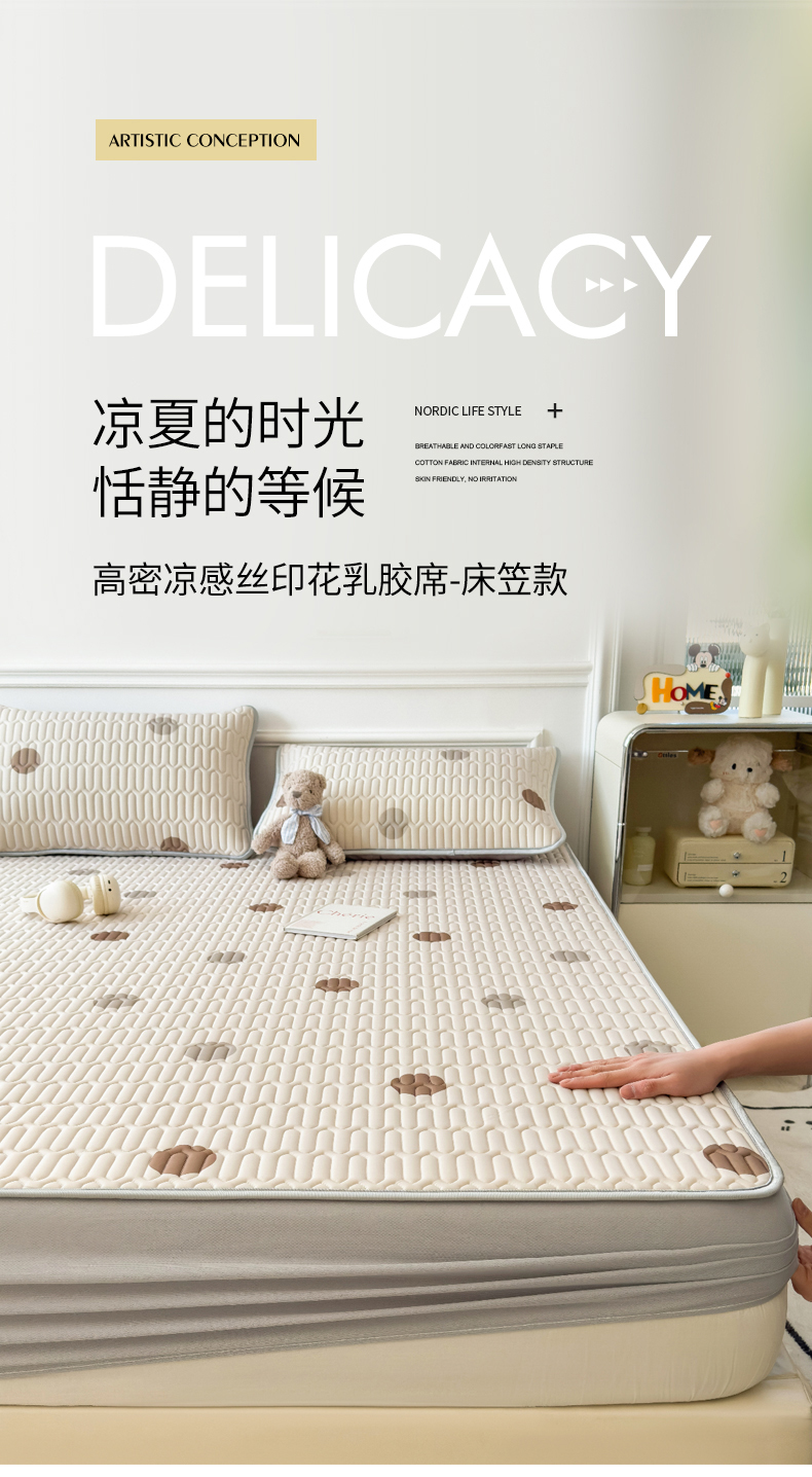 (总)丝羽坊 2026新款高密凉感丝印花乳胶凉席-床笠款,雾蓝花影,萌宠拼格,粉黛萌兔,格纹蝶影,奶白萌犬,浅蓝熊趣,糖果猫咪,彩糖点点,林间私语,薄荷甜心,爱的圈圈,春意盎然,奶绿汪仔,小白兔,小企鹅,小兔派对,星月