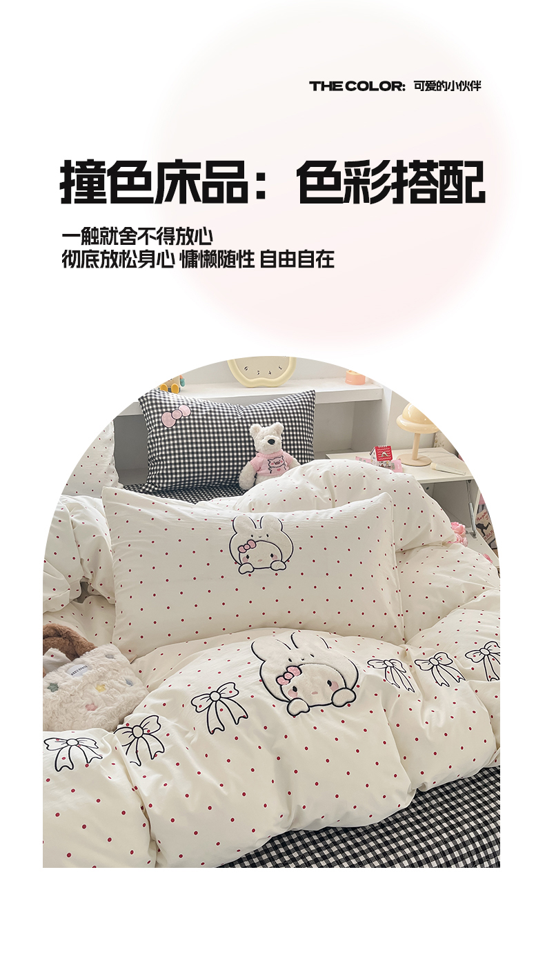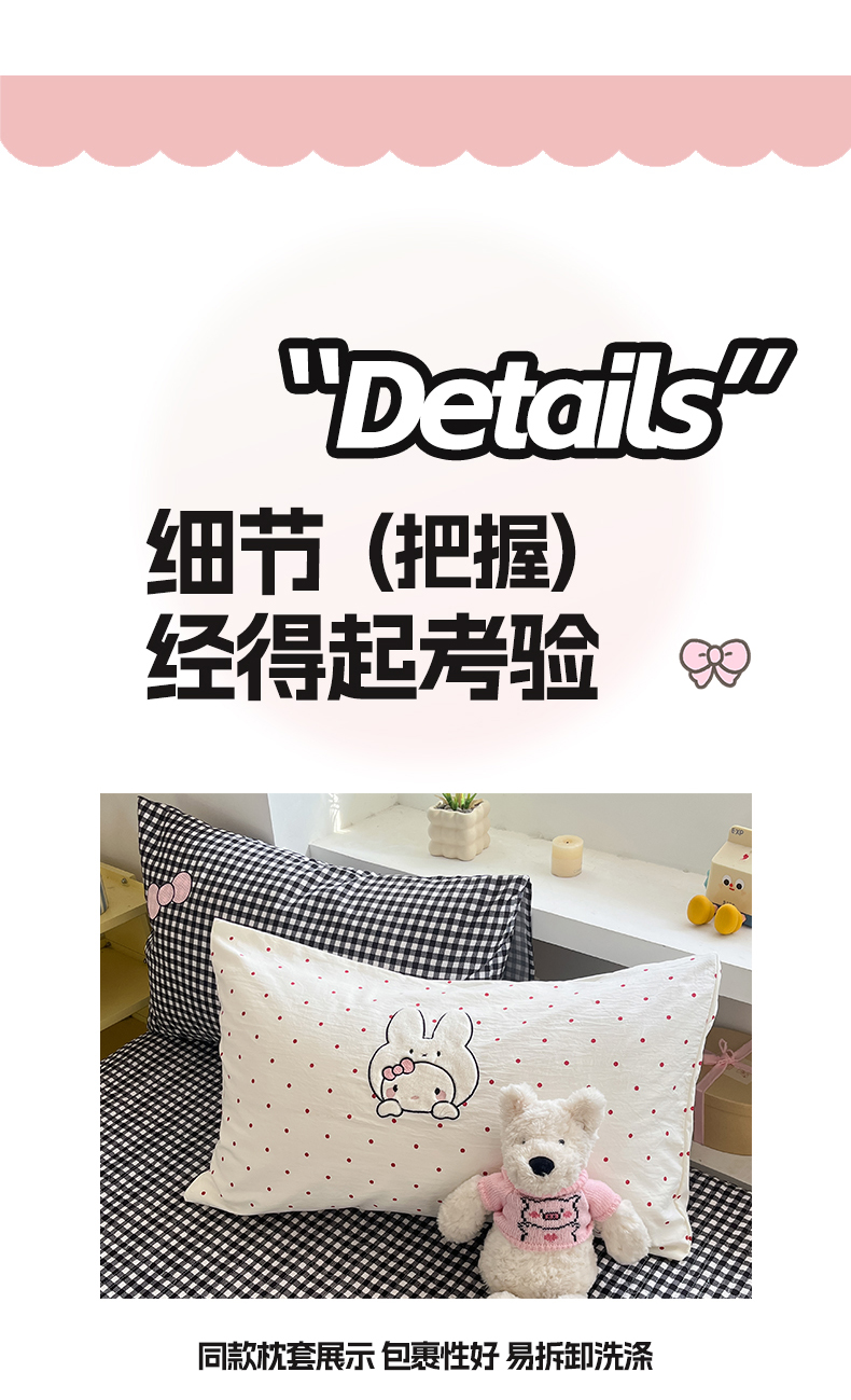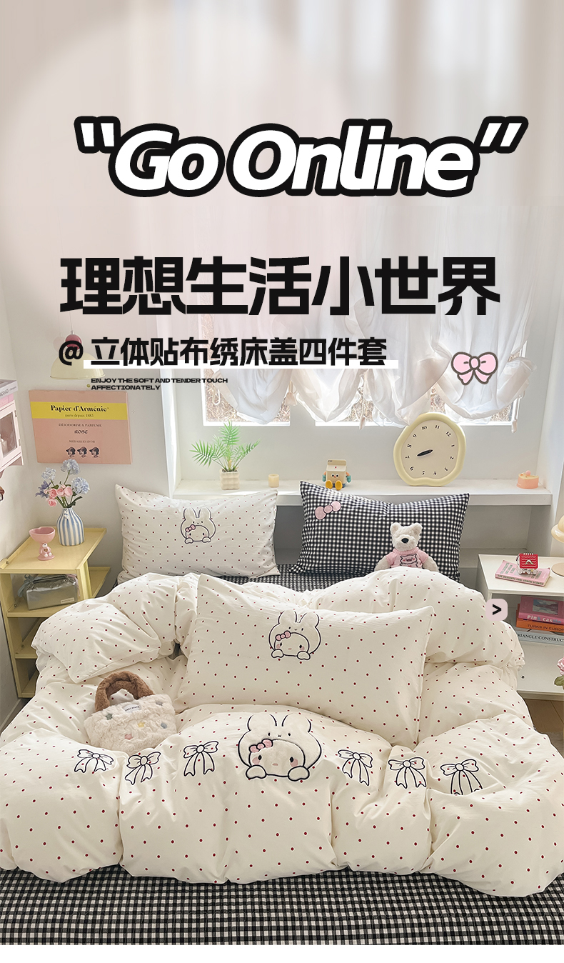 • 91家纺网 家纺一手货源 找家纺 格真 2026新款立体绣花贴布绣单品枕套被套三件套 小白兔波点红