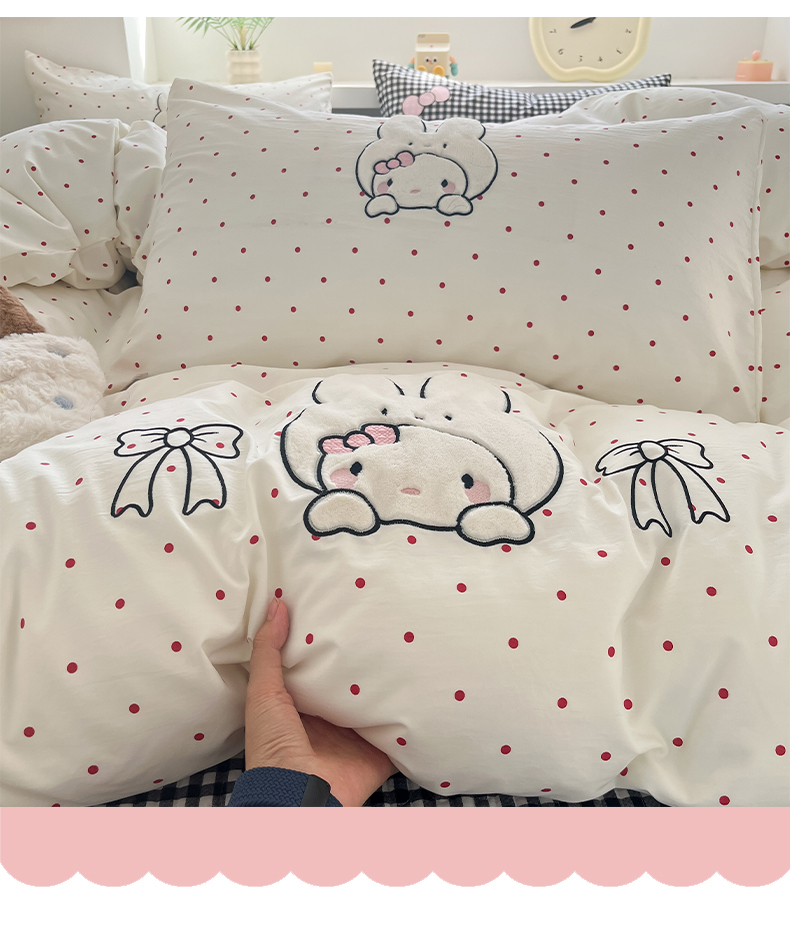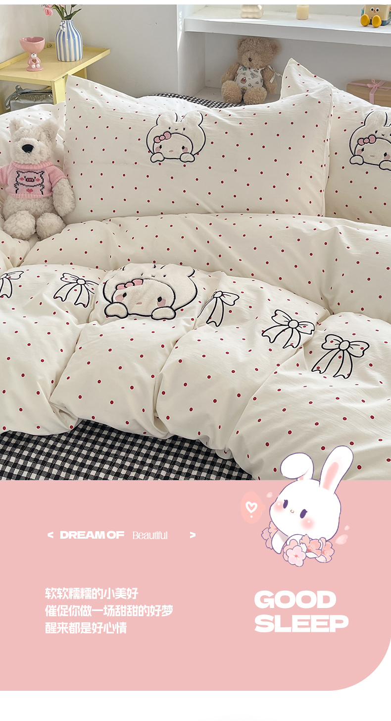 格真 2026新款立体绣花贴布绣单品枕套被套三件套 小白兔波点红