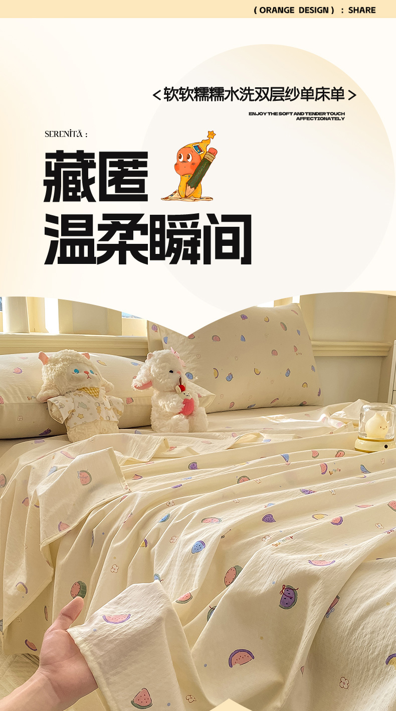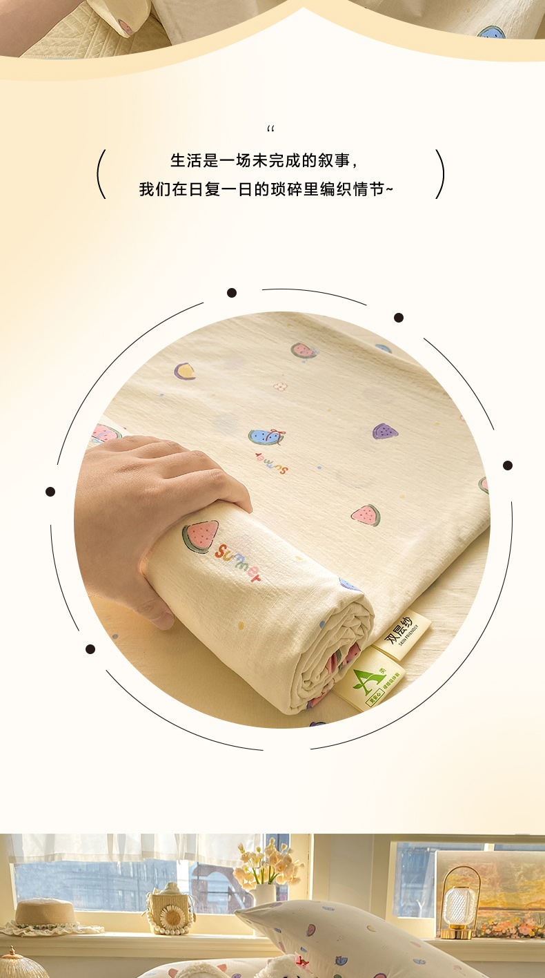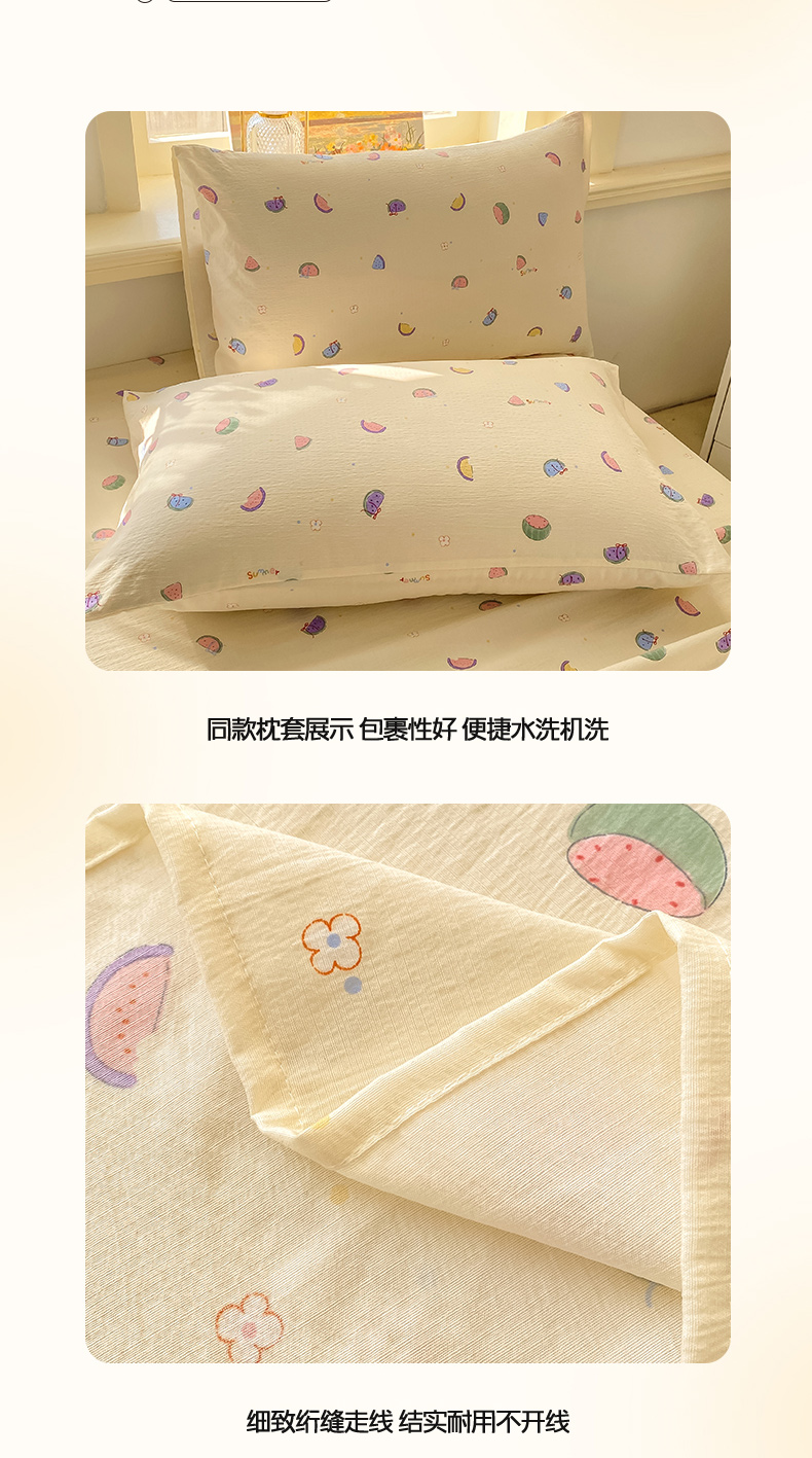• 91家纺网 家纺一手货源 找家纺 晓时候 2026新款A类云感双层纱床单三件套单品单件床单 缤纷水果