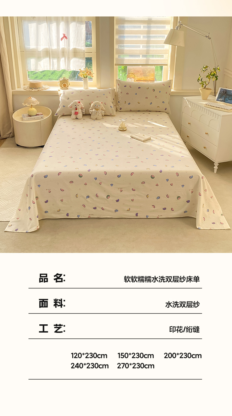 (总)晓时候 2026新款A类云感双层纱床单三件套单品单件床单,安然入夏,缤纷水果,冰川灰,豆蔻,多彩波点,繁花,蝴蝶结-紫,花间兔,蓝色泡芙狗,洛神花间,萌宠派对,萌萌星星人,奶芙狗,柠檬黄,芊芊花语,牵牛紫,俏皮狗,青春蓝,青竹绿,甜甜西高地,甜心女孩,小确幸,星星喵,樱花粉,云朵白