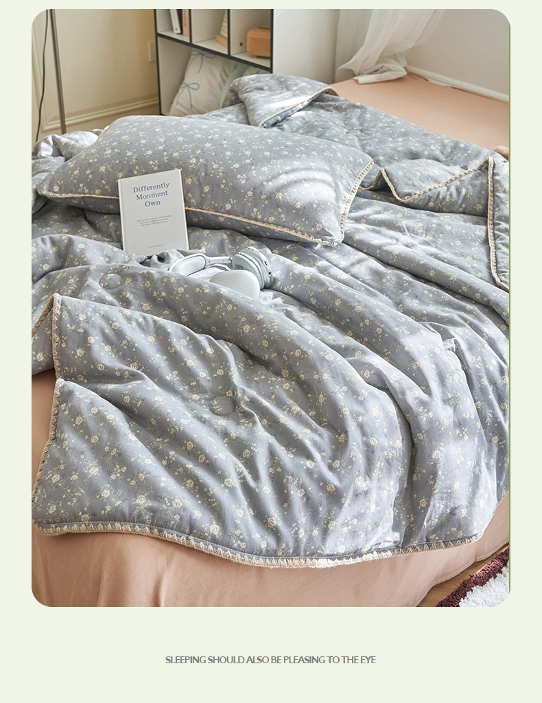 恬思语家纺 2026春夏全棉双层纱棉花夏被空调被夏凉被四件套贝壳边系列 蓝汐-灰