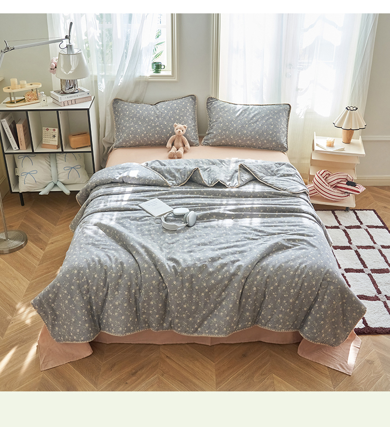 • 91家纺网 家纺一手货源 找家纺 恬思语家纺 2026春夏全棉双层纱棉花夏被空调被夏凉被四件套贝壳边系列 蓝汐-灰