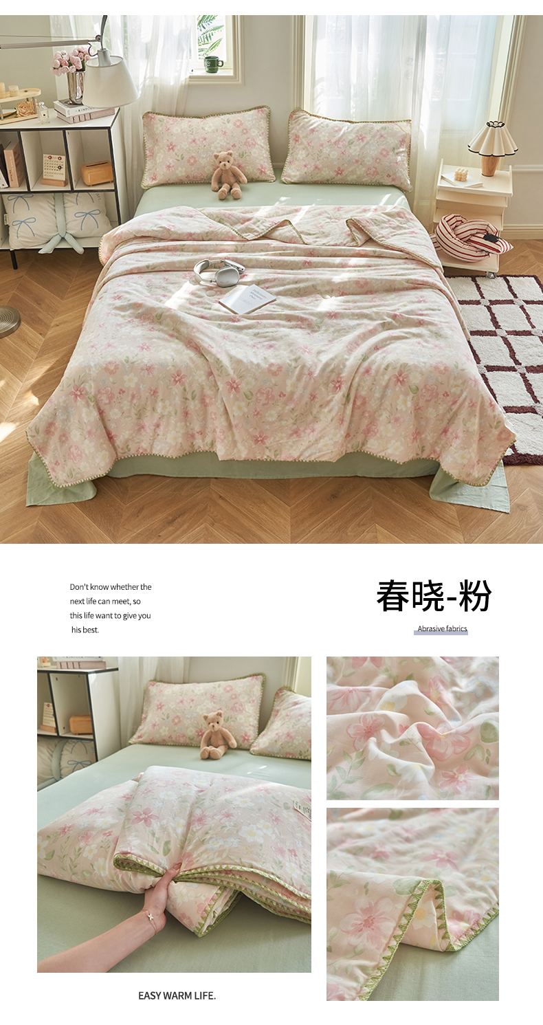 (总)恬思语家纺 2026春夏全棉双层纱棉花夏被空调被夏凉被四件套贝壳边系列,Ш櫻漫语,彩星芒,春晓-粉,春晓-绿,粉粉猫,花从兔-紫,咖啡狗,蓝汐-灰,南瓜派对,浅花町,阳光小马,云絮花-蓝,组合图仅供参考不可下单