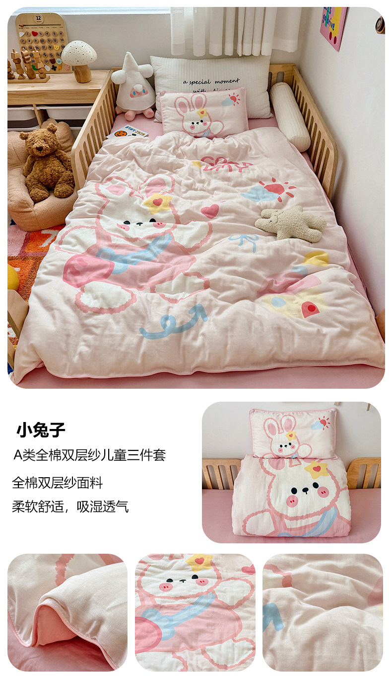 当前位置: 91家纺网 > 商品网购 > 床品套件 > 三件套 > 萌宝家纺 2026新款母婴A类全棉双层纱儿童被套纯棉纱布三件套 小兔子