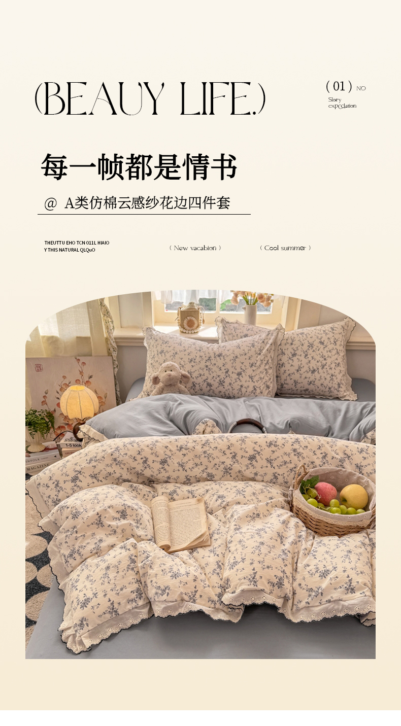 (总)梦忧草 2026新款春夏新款法式花边小清新四件套仿棉云感纱三件套单被套单件