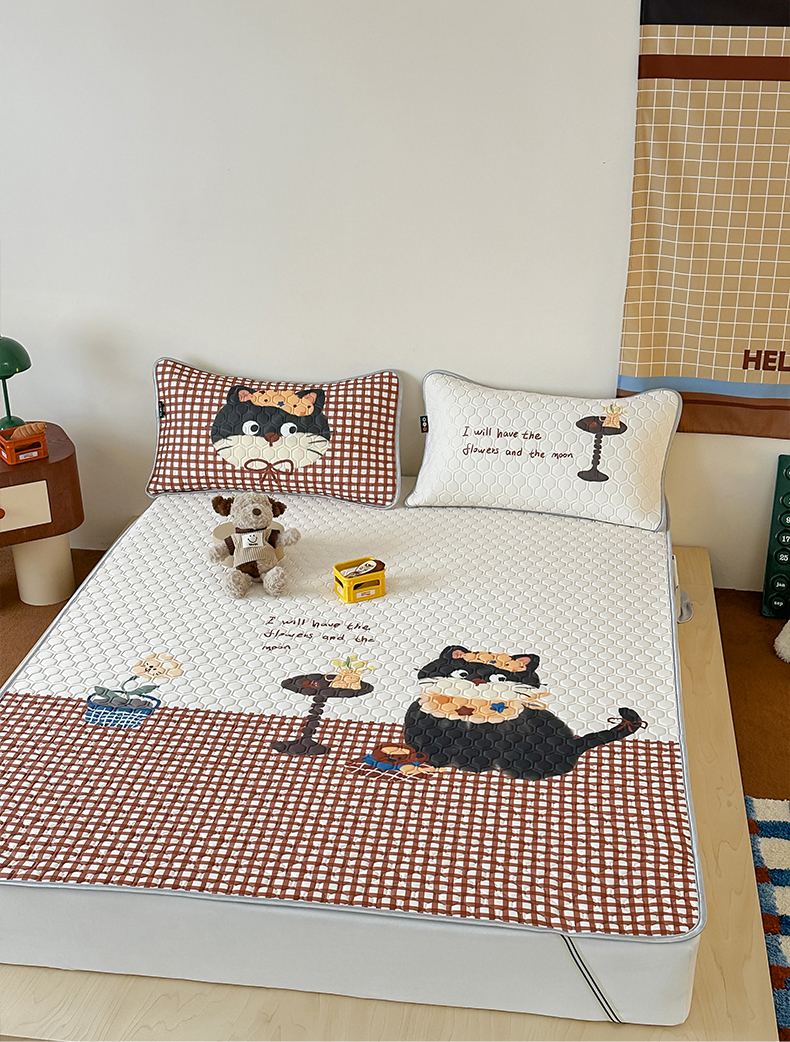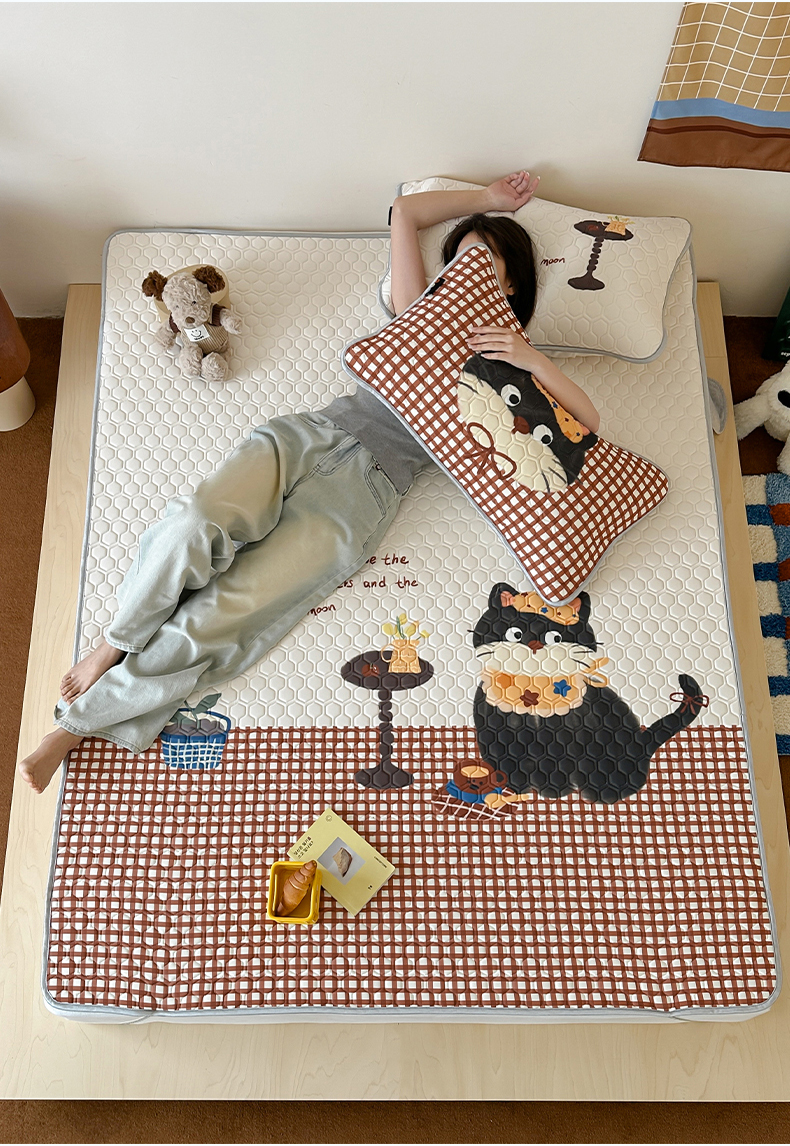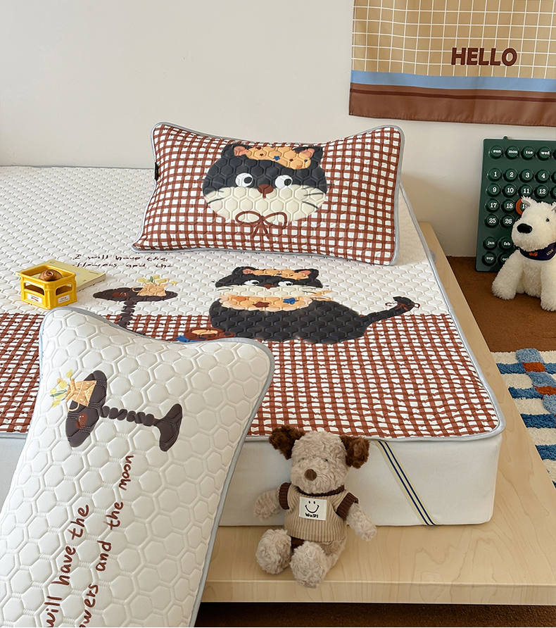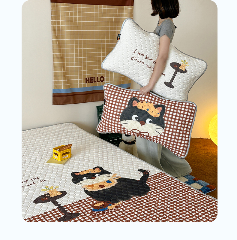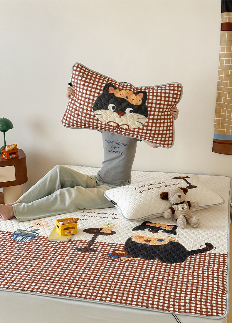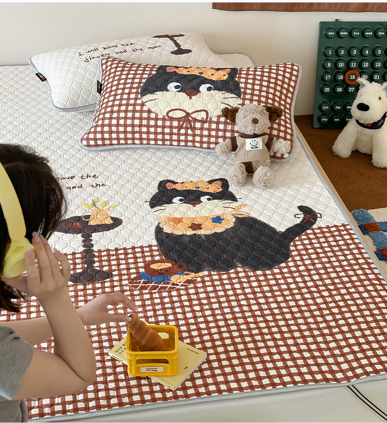 商品名称:RYB红黄兰 2026新款ins设计师原创款大版冰皮凉感水洗乳胶加厚6mm凉席三件套 红格猫咪