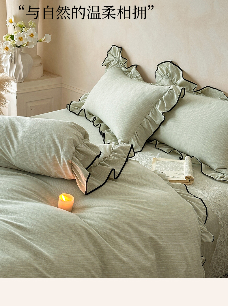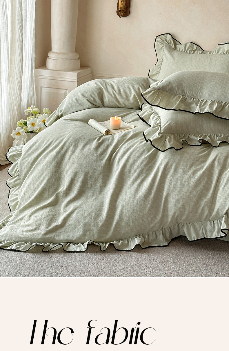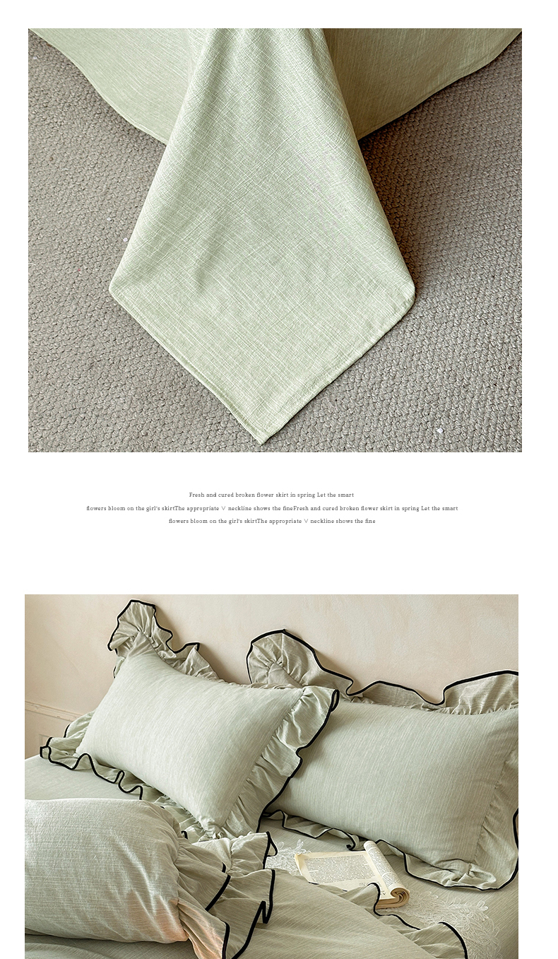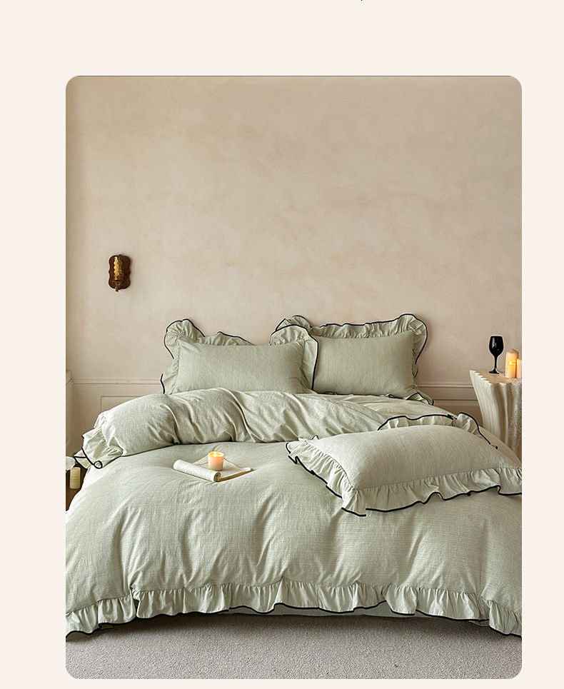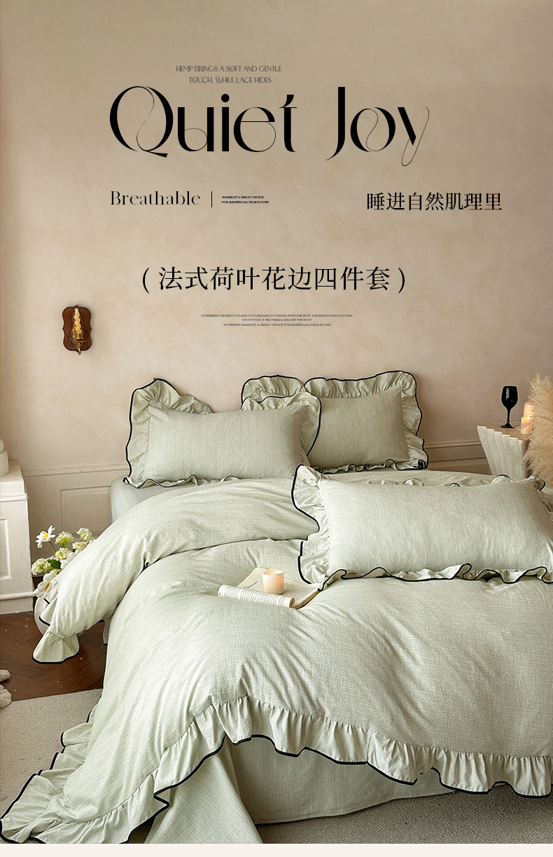 当前位置: 91家纺网 > 商品网购 > 床品套件 > 四件套 > 其它四件套 > 苏源家居 2026新款法式黑包边亚麻公主风荷叶边四件套-清欢 清欢-麻雅绿