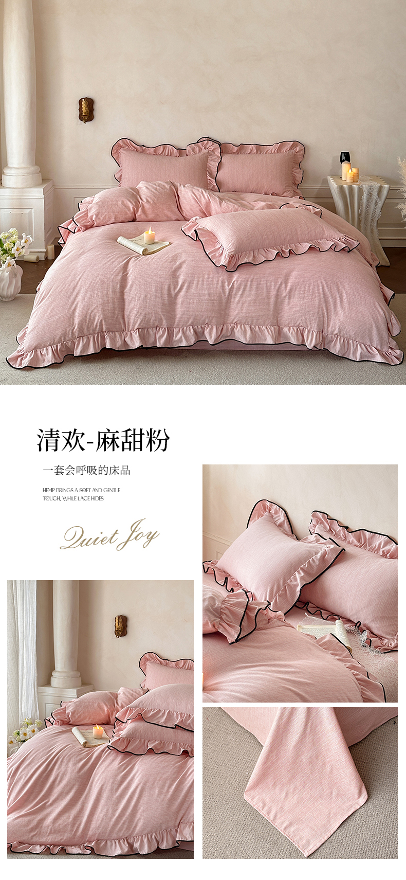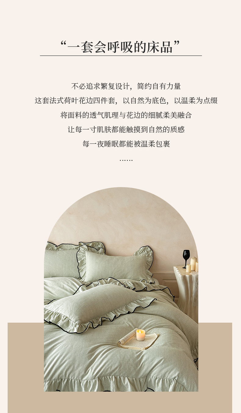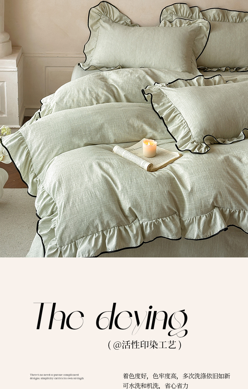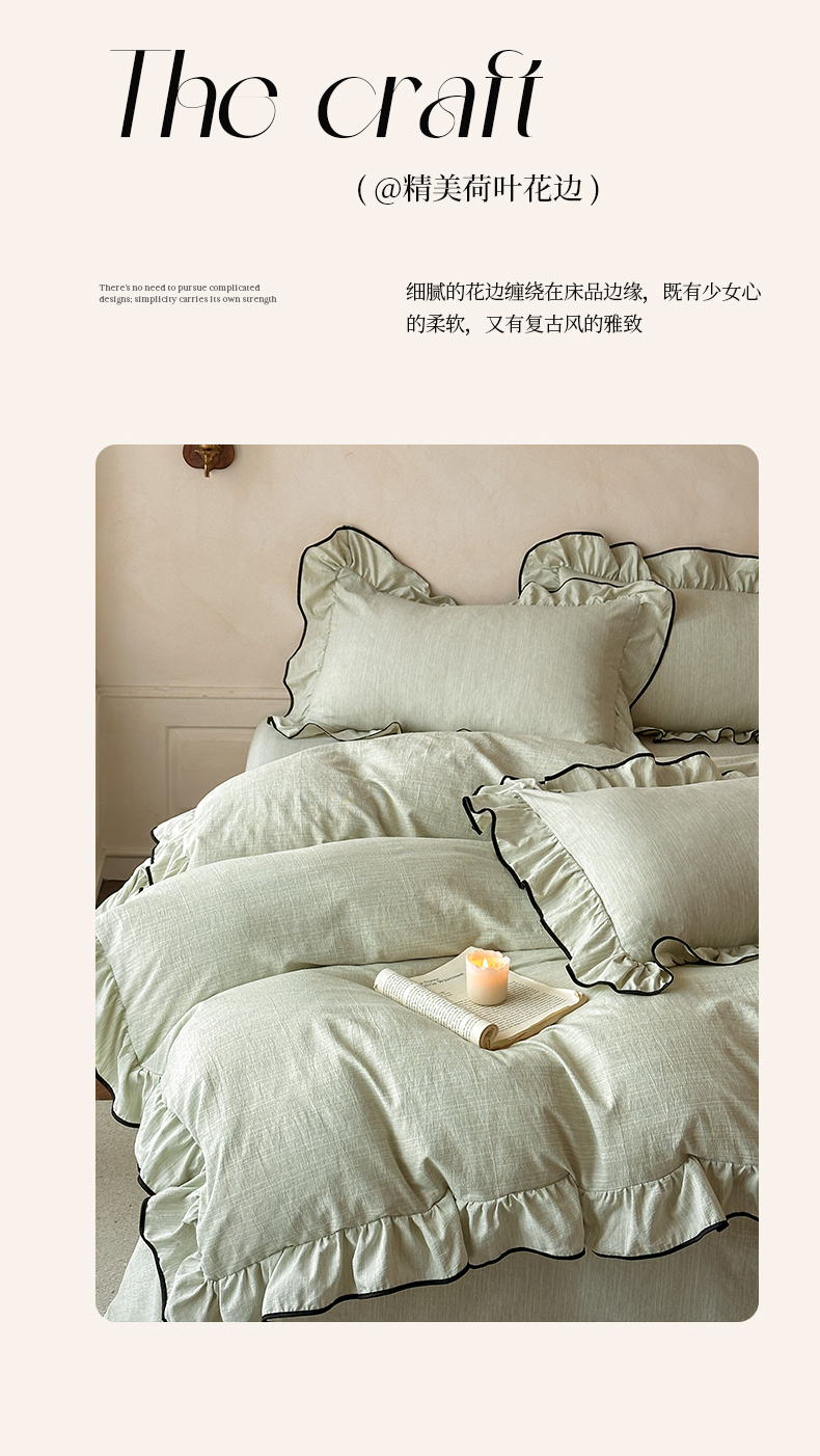 当前位置: 91家纺网 > 商品网购 > 床品套件 > 四件套 > 其它四件套 > 苏源家居 2026新款法式黑包边亚麻公主风荷叶边四件套-清欢 清欢-麻雅绿