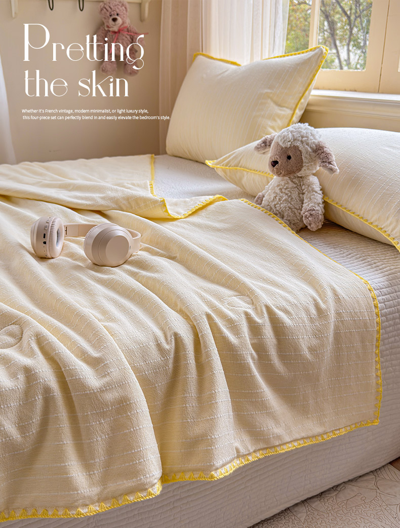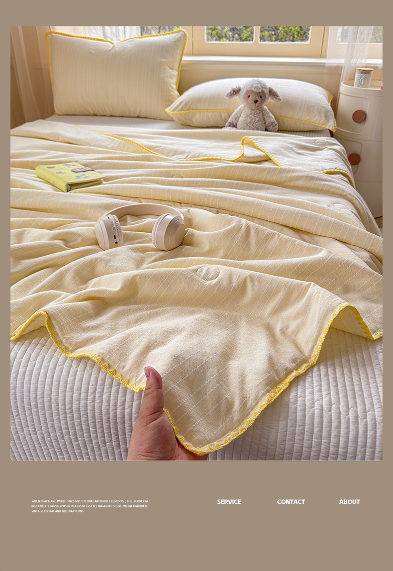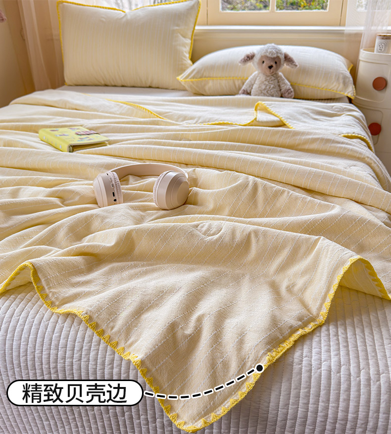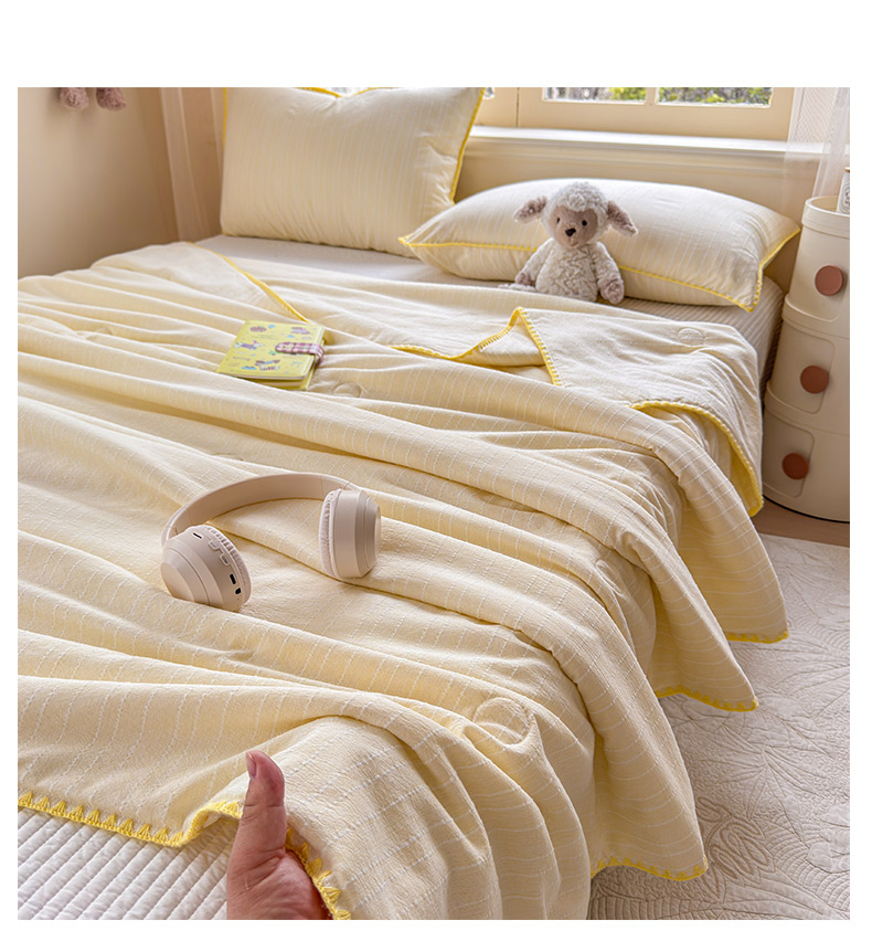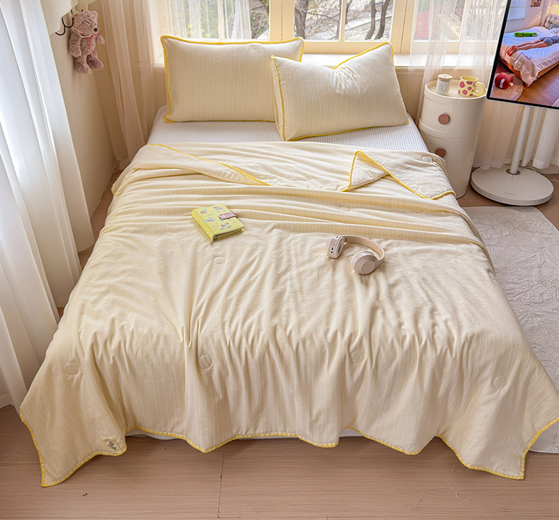 被子 > 夏被 > 鑫利来家纺 2026新款纯色无印风夏被简约素色法式麻夏凉被阳离子色织提花单人双人学生夏凉被-场景二 青禾-米黄