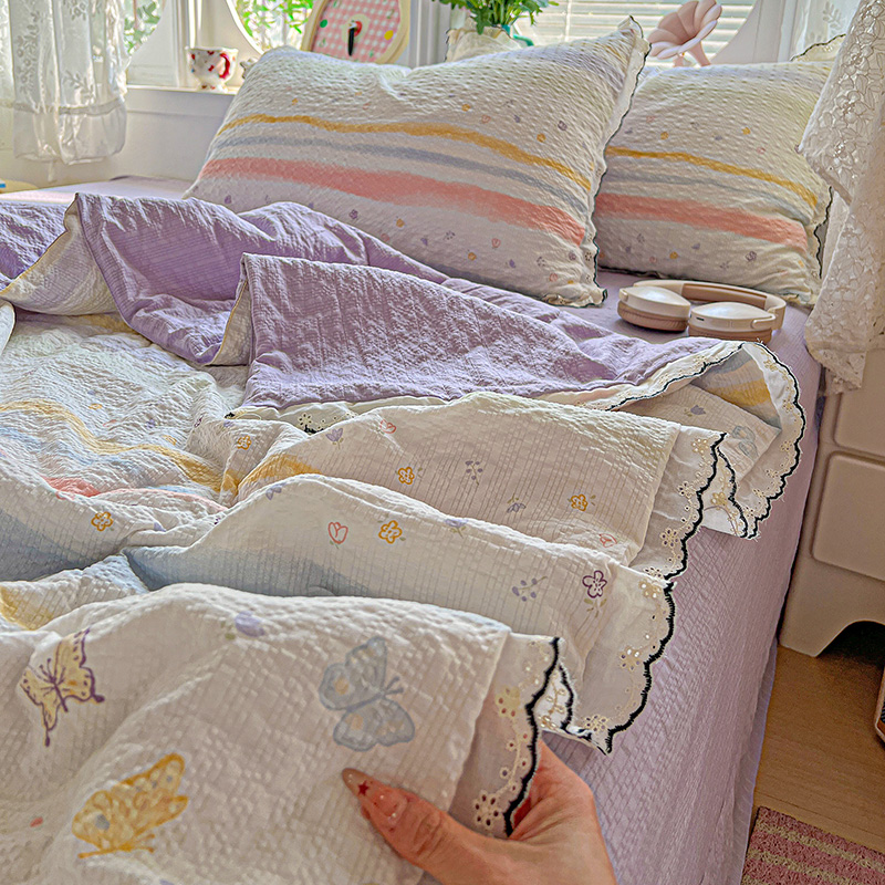 (总)一比一家纺 2026新款彩色花边木棉皱皱纱夏被四件套,阿吉豆,初心粉,初心蓝,扶摇,赫本,花间女孩,花漫漫,阑珊,罗卡,奶芙喵,甜心格格,午后花园,小马驹,邂逅,野餐兔,樱花季,悠然,紫烟