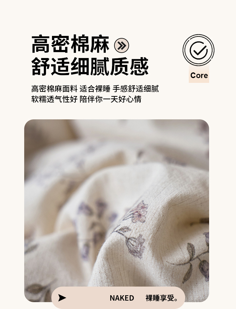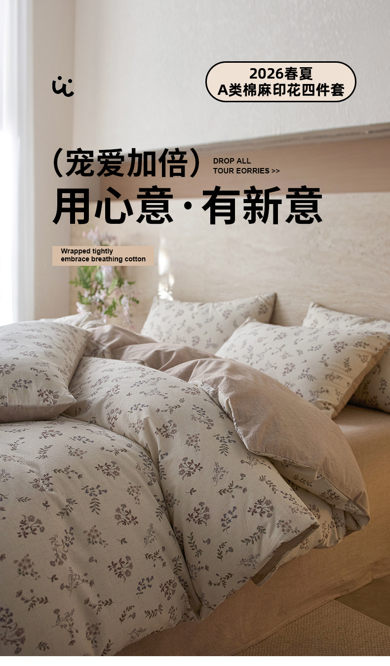 当前位置: 91家纺网 > 商品网购 > 床品套件 > 四件套 > 棉麻四件套 > 亿梵家居 2026春夏新款A类棉麻印花四件套 花间微澜