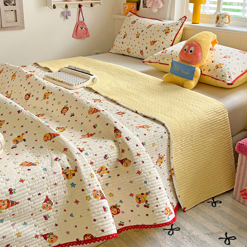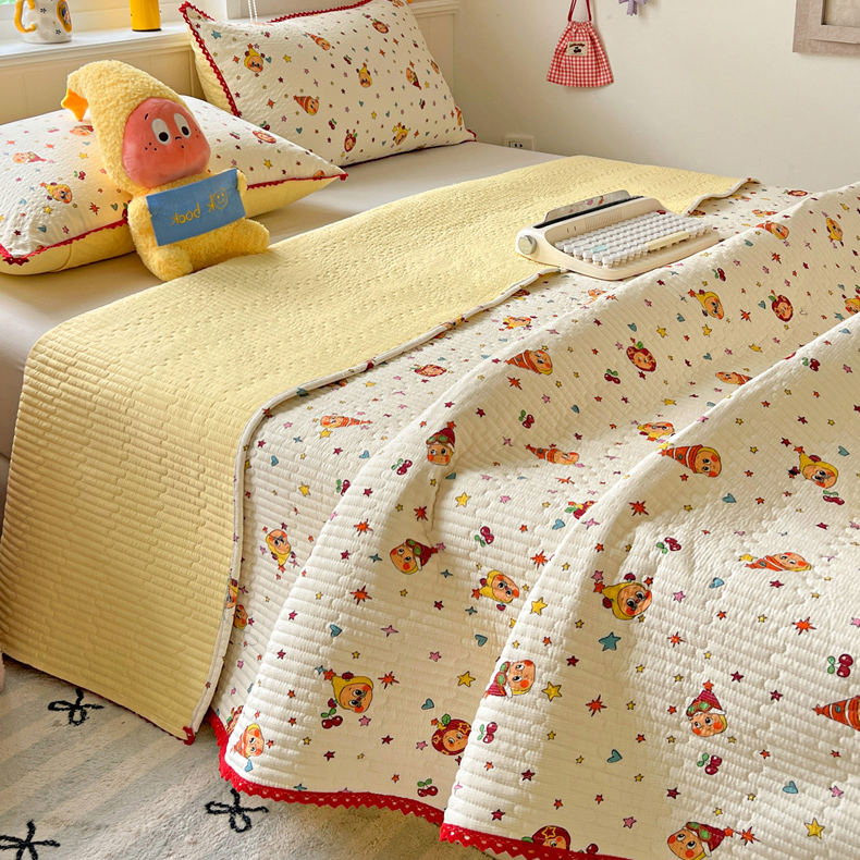 恒尚居 2026新款A类泡芙纱床盖四套件泡芙棉双层纱小花边床垫床褥 奶黄星星人小花边