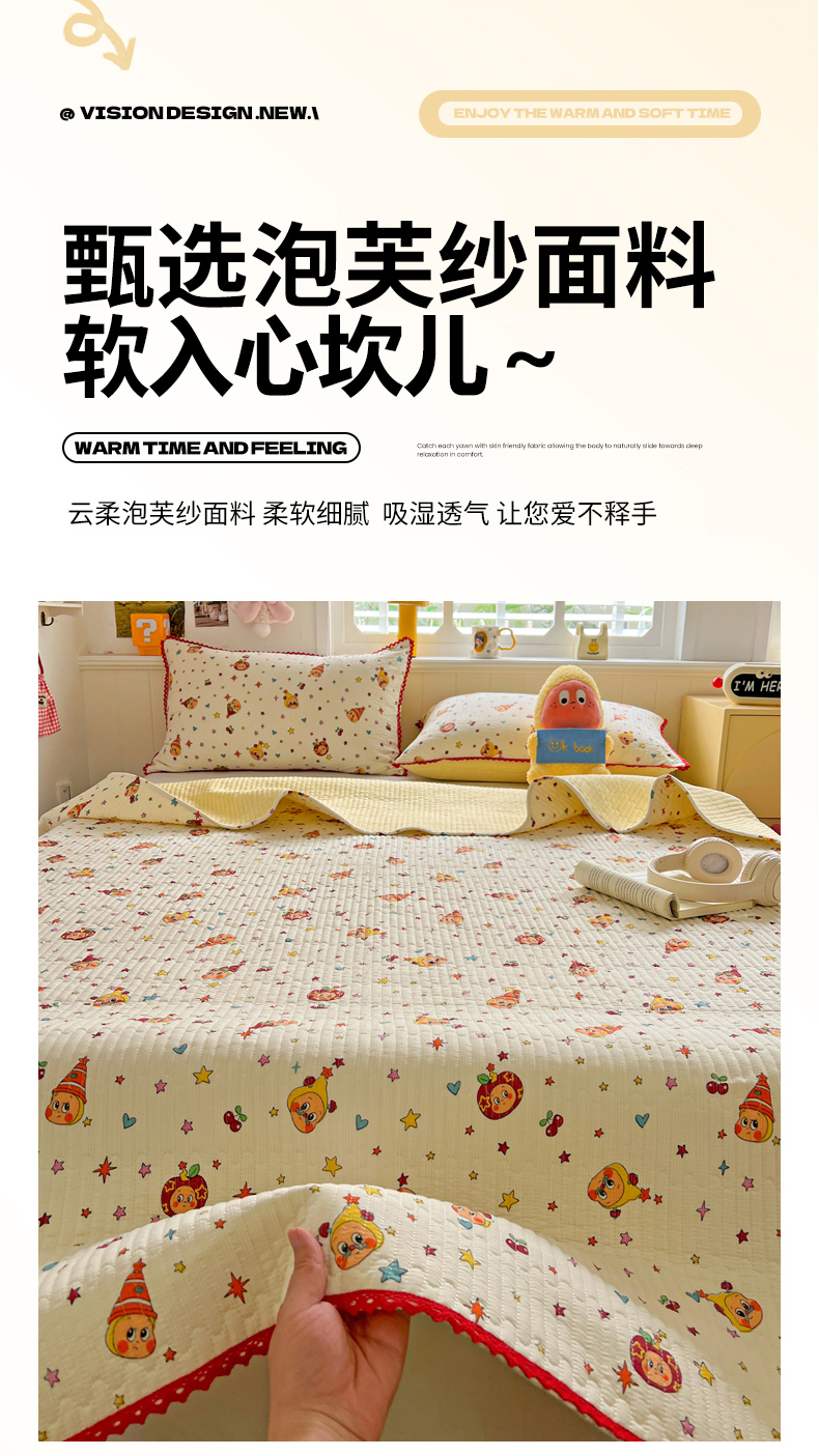 商品名称:恒尚居 2026新款A类泡芙纱床盖四套件泡芙棉双层纱小花边床垫床褥 奶黄星星人小花边
