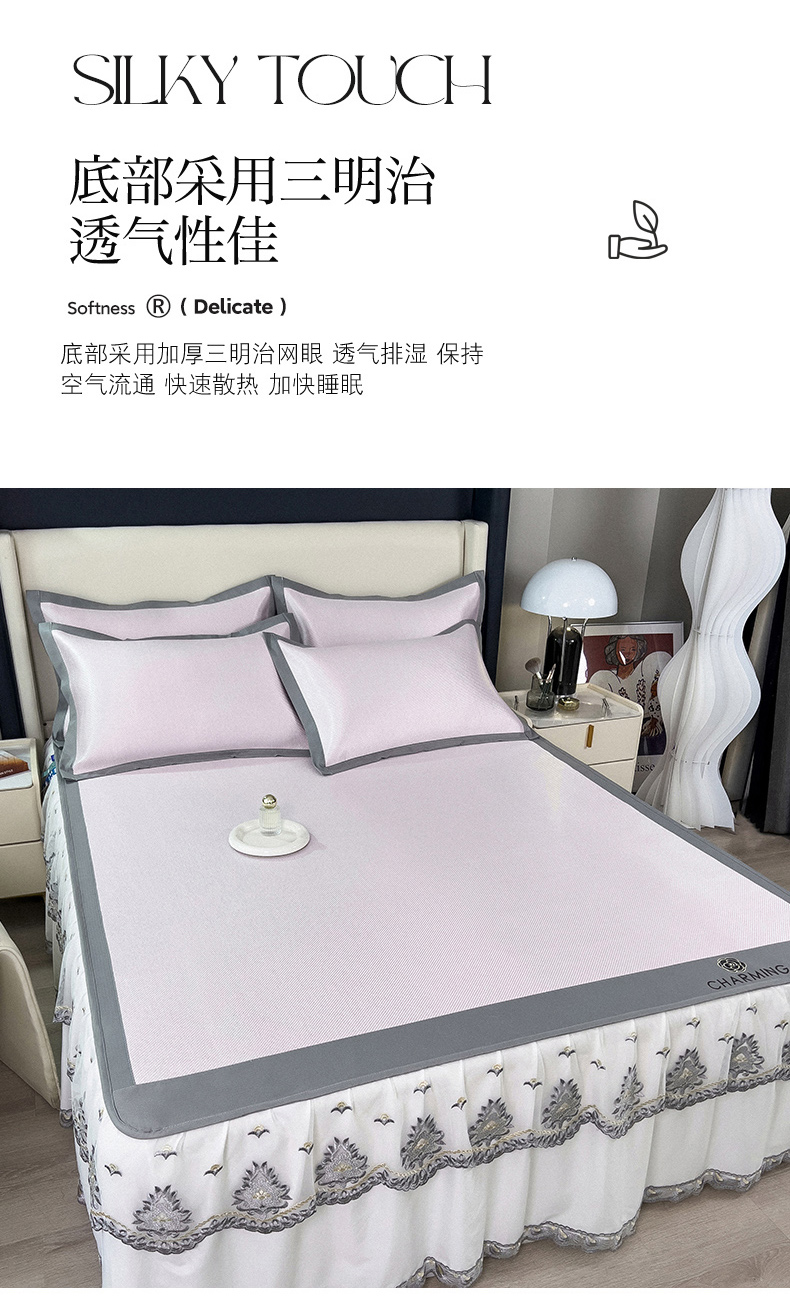 (总)印季家纺 2025新款纯色加密冰藤床裙凉席,粉色,灰色,咖啡,浅紫,水绿,天蓝