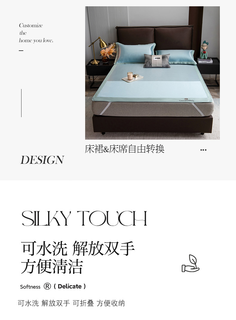 (总)印季家纺 2025新款纯色加密冰藤床裙凉席,粉色,灰色,咖啡,浅紫,水绿,天蓝